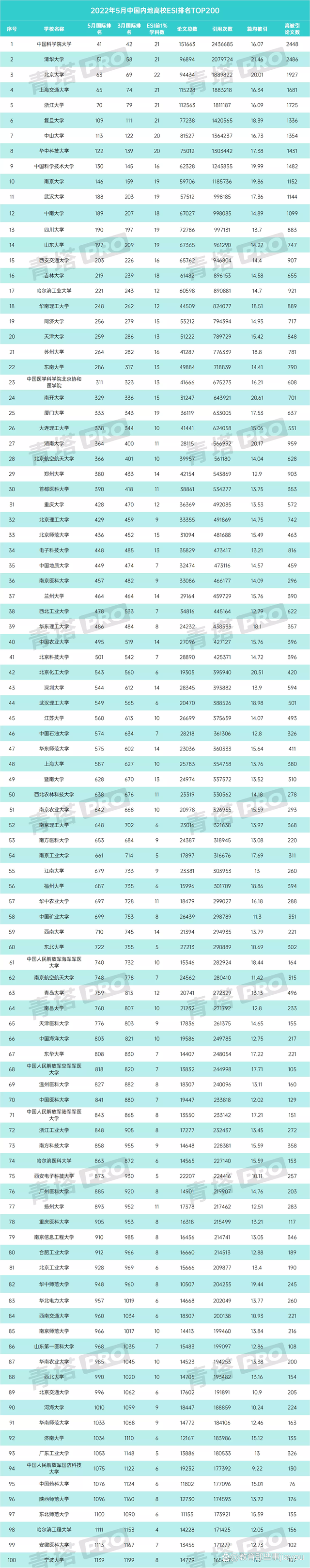 5月12日,科睿唯安(Clarivate Analytics)公布了2022年5月的ESI最新数据。 ESI(基本科学指标数据库)是目前世界范围内普遍用以评价高校、学术机构、国家或地区国际学术水平及影响力的重要评价指标工具之一。 本次数据覆盖时间范围为2012年1月1日至2022年2月28日。 从国际排名来看,中国科学院大学依旧稳居中国内地高校第一宝座,目前位居全球第41名;清华大学位居国内高校第二名,国际排名为第51位。排在国内高校第三位的是北京大学,目前位居全球第63名,紧随其后的是上海交通大学(国际排名65位)、浙江大学(国际排名70位)。国际排名前200的高校还有复旦大学位列109位,中山大学位列113位,华中科技大学位列122位,中国科学技术大学位列130位,南京大学位列146位,武汉大学位列188位,中南大学位列189位,四川大学位列190位,山东大学位列197位。 版权声明本文来源:科睿唯安,仅用于学术分享,转载请注明出处。若有侵权,请联系 |