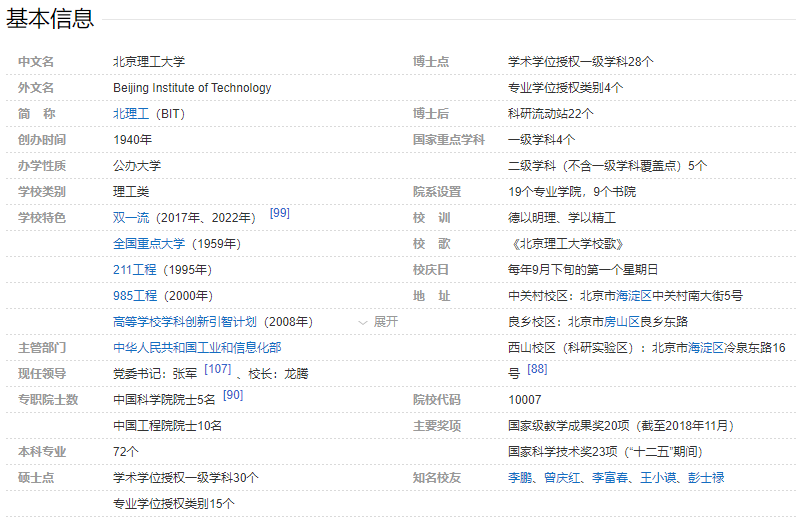 北京理工大学1940年诞生于延安,是中国共产党创办的第一所理工科大学,是新中国成立以来国家历批次重点建设的高校,首批进入国家“211工程”和“985工程”,首批进入“世界一流大学”建设高校A类行列,现隶属于工业和信息化部。毛泽东同志亲自题写校名,李富春、徐特立、李强等老一辈无产阶级革命家先后担任学校主要领导。80余年来,北京理工大学始终听党话、跟党走,坚持为党育人、为国育才,走出了一条中国共产党创办和领导中国特色高等教育的“红色育人路”,一条立足国防传统优势、服务国家战略的“强军报国路”,一条开放包容、融合协同的“创新发展路”。 栉风沐雨,北京理工大学伴随着党和国家教育事业的发展成长壮大。1949年,学校迁入北京;1952年,定名为北京工业学院,成为新中国第一所国防工业院校;1988年,更名为北京理工大学。学校现设有21个专业学院、9个书院以及前沿交叉科学研究院、先进结构技术研究院、国家安全与发展研究院等8个其他教学科研机构,设有27个基层党委、3个党总支、3个直属党支部;现有教职工5600余人,汇聚了32名两院院士、350余名国家级人才计划入选者、6个国家级教学团队;建有13个国家级重点实验室及工程研究中心和6个国家级实验教学中心。近年来,学校坚持“四个面向”,围绕“顶尖工科、优质理科、精品文科、新兴医工”学科建设方针,系统构建工理管文医协同发展格局,现有9个学科门类,31个一级学科点,其中,30个一级博士点。设有15个专业学位类别,其中,4个工程博士类别。9个学科进入全国前10%,兵器学科位居全国第一。8个学科领域进入世界一流行列,3个学科领域进入世界一流前列。 立德树人,北京理工大学在全面提升人才培养质量中传承红色基因。学校致力于培养“胸怀壮志、明德精工、创新包容、时代担当”的领军领导人才。在建校80多年以来的30余万毕业生中,有李鹏、曾庆红、叶选平等党和国家领导人,以及120余位省部级以上党政领导和将军;有国家最高科学技术奖获得者王小谟、我国第一艘核潜艇总设计师彭士禄等60余位院士;有各个行业、各个层面的大批领袖人才和优秀建设者,被誉为“红色国防工程师的摇篮”。学校现有全日制在校生3万余人,设有本科专业75个,其中,国家一流专业36个、新工科专业8个。“十三五”以来,学校获国家级教学成果奖6项,获全国优秀教材奖7项,获批国家级一流课程39门,新增北京市教学名师20人,研究生获全国学会优秀学位论文96篇。获批建设国家级双创示范基地,累计获中国国际“互联网+”大学生创新创业大赛总冠军2次、金奖22项;累计获“挑战杯”全国大学生课外学术科技作品竞赛特等奖7项、一等奖17项;累计获“挑战杯”中国大学生创业计划竞赛金奖13项。面向国际,学校与深圳市人民政府、莫斯科国立罗蒙诺索夫大学共建深圳北理莫斯科大学,与6大洲77个国家和地区的362所高校签订校级合作协议,与德国慕尼黑工业大学、亚琛工业大学、俄罗斯鲍曼国立技术大学、荷兰代尔夫特理工大学、日本东京工业大学、以色列理工大学、美国伊利诺理工大学、澳大利亚国立大学、香港科技大学等100多所合作院校设立学生交换项目,形成人才培养国际化的全球网络。 矢志创新,北京理工大学在打造国家战略科技力量中展现时代担当。学校始终与党和国家同呼吸、共命运,坚持瞄准国家重大战略需求和世界科技发展前沿锐意进取。学校曾创造了新中国科技史上多个“第一”:第一台电视发射接收装置、第一枚二级固体高空探测火箭、第一辆轻型坦克、第一部低空测高雷达、第一台20公里远程照相机等,在精确打击、高效毁伤、机动突防、远程压制、军用信息系统与对抗等国防科技领域代表了国家水平,在智能仿生机器人、绿色能源、现代通信、工业过程控制等军民两用技术方面具有明显优势。在国庆70周年庆祝活动中,学校共参与了受阅装备中12个空中方队中的10个方队、32个地面装备方队中的26个方队的装备研制工作,并直接参与了多项数字表演与仿真任务、焰火技术任务和彩车设计等技术保障工作。在中国共产党成立100周年、北京奥运会、北京冬奥会、上海世博会、广州亚运会等重大活动中,以及神舟十二号载人飞船与天和核心舱空间交会对接等重大任务中,学校研发的多项技术均有优异表现。“十三五”期间,学校科技投入经费超过182亿元,产生了一批高水平科技成果,牵头获国家科学技术奖21项,其中一等奖3项;首批入选教育部高等学校科技成果转化和技术转移基地,面向国家安全与国计民生实施系列科技成果转化,6个典型案例集中亮相国家“十三五”科技创新成就展。 号角激昂,北京理工大学承载着光荣与梦想扬帆起航。“延安根、军工魂”是镌刻进北京理工大学的红色基因。“德以明理、学以精工”的校训,“团结、勤奋、求实、创新”的校风,徐特立老院长倡导的“实事求是、不自以为是”的学风,共同铸就了学校独特的精神气质和文化内核。从1940年在延安诞生为抗战建国服务,到21世纪的今天为创新型国家建设培养高层次人才;从露天课堂、吃住窑洞,到现代化校区、国家重点实验室。面向未来,学校将继续坚持以习近平新时代中国特色社会主义思想为指导,紧紧围绕立德树人这一根本任务,坚持办学正确政治方向,努力形成高水平人才培养