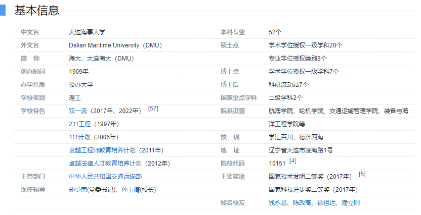 大连海事大学(原大连海运学院)是交通运输部所属的全国重点大学,是国家“211工程”重点建设高校、国家“双一流”建设高校,是交通运输部、教育部、国家海洋局、国家国防科技工业局、辽宁省人民政府、大连市人民政府共建高校。学校素有“航海家的摇篮”之称,是中国著名的高等航海学府,是被国际海事组织认定的世界上少数几所“享有国际盛誉”的海事院校之一。 大连海事大学的发展历史,代表了中国高等航海教育的发展历程。学校在民族饱受外辱、国运衰败之际萌发创办,并肩负着“挽救航权,振兴国运”的历史使命,虽几经周折、历经磨难,但始终薪火相传,不断发展,培养了大批航运事业的栋梁之才,为振兴和发展国家航运事业作出了重要贡献。 大连海事大学源于1909年设立的邮传部上海高等实业学堂船政科。1911年以船政科为基础创办邮传部上海高等商船学堂,1912年更名为吴淞商船学校,1915年停办,1929年复校后更名为交通部吴淞商船专科学校,1937年再度停办,1939年于重庆复校并更名为国立重庆商船专科学校,1943年并入位于重庆的国立交通大学,1946年于上海复校并更名为国立吴淞商船专科学校,1950年与交通大学航业管理系合并成立上海航务学院。1953年,中央人民政府决定将上海航务学院与发端于1927年东北商船学校的东北航海学院合并组建大连海运学院,同年,发端于1920年集美学校水产科的福建航海专科学校并入。1960年,学校被确定为全国重点大学。1963年,国务院批准学校航海类专业实施半军事管理。1983年,联合国开发计划署(UNDP)和国际海事组织(IMO)在学校设立了亚太地区国际海事培训中心。1985年,世界海事大学在学校设立分校。1994年,学校更名为大连海事大学,江泽民同志亲笔为学校题写了校名。1997年,学校成为国家“211工程”重点建设高校。1998年,学校质量管理体系通过国家港务监督局和挪威船级社(DNV)认证,成为国内率先将ISO9001质量管理体系引入人才培养质量管理的高校。2000年,大连海运学校“划归管理”。2017年,学校进入国家“一流大学和一流学科”建设高校行列。通过不断地建设和发展,学校在办学规模、办学层次等方面已居于世界同类院校前列。 大连海事大学所取得的成就以及在国内外所享有的声誉得到了中央领导的充分肯定和高度评价,1993年,江泽民、温家宝、曾庆红、李岚清等党和国家领导人先后视察了大连海事大学。江泽民同志亲笔为学校题词“坚定、严谨、勤奋、开拓,建设世界第一流的高等航海学府!”2009年,学校成功举办了“中国高等航海教育暨大连海事大学建校100周年”纪念活动,李长春、张德江、刘延东、陈至立等党和国家领导人向学校致信或题词祝贺,刘延东、陈至立等党和国家领导人分别视察了学校。 大连海事大学位于中国北方海滨名城大连市西南部。学校占地面积136万平方米,校舍建筑面积95万平方米。学校拥有设施和功能齐全的航海类专业教学实验楼群、航海训练与工程实践中心、水上求生训练馆、教学港池、图书馆、游泳馆、天象馆等;拥有航海模拟实验室、轮机模拟实验室等100余个教学科研实验室,拥有2艘远洋教学实习船。 大连海事大学设有航海学院、轮机工程学院、船舶电气工程学院、信息科学技术学院、交通运输工程学院、航运经济与管理学院、船舶与海洋工程学院、环境科学与工程学院、人工智能学院、法学院、外国语学院、公共管理与人文艺术学院、马克思主义学院、理学院、国际联合学院、体育工作部、创新创业学院、继续教育学院(交通运输高级研修学院)、航海训练与工程实践中心、人文社科研究院(航运发展研究院)、留学生教育中心等21个教学科研机构。在校本科生、研究生共计2万余人,同时招收攻读学士、硕士、博士学位的外国留学生。并校60多年来,学校为国家培养了各类高级专业技术人才十余万名,其中大多数已成为我国航运事业的骨干力量。 大连海事大学拥有54个本科专业,9个一级学科博士学位授权点、21个一级学科硕士学位授权点、7个博士后流动站,拥有14个硕士专业学位授权类别。学校现拥有2个国家重点学科,14个省部级重点学科,2个省重点培育学科,工程学科、计算机科学进入ESI全球前1%;2个国家级工程研究中心,2个国家级科技合作基地,11个省级专业技术创新中心和工程研究中心,26个省部级重点实验室,6个省级人文社会科学重点研究基地;1个国家级创新人才培养示范基地,1个国家级协同创新中心,5个专业列入国家卓越工程师教育培养计划,1个国家级卓越法律人才教育培养基地,6个国家特色专业建设点,11个国家一流专业建设点,1个全国工程教育专业认证专业,1个国家级教学团队,1个国家级人才培养模式创新实验区,1门国家级精品课程,1个全国教材建设先进集体,3门IMO示范课程,1门国家级双语示范课程,6门国家级精品视频公开课程,1门国家级精品资源共享课程,3门国家级精品在线开放课程,18门国家级一流本科课程,6个国家级教学成果奖,4个国家级工程实践教育中心,4个国家级实验教学示范中心,4个国家大学生校外实践教育基地,1个国家级虚拟仿真实验教学中心,2个国家级示范性虚拟仿真实验教学项目,129个教育部产学合作协同育人项目,20个辽宁省一流专业建设点,11个省级特色(示范性)专业,7个省级本科综合改革试点专业,4个省级本科工程人才培养模式
