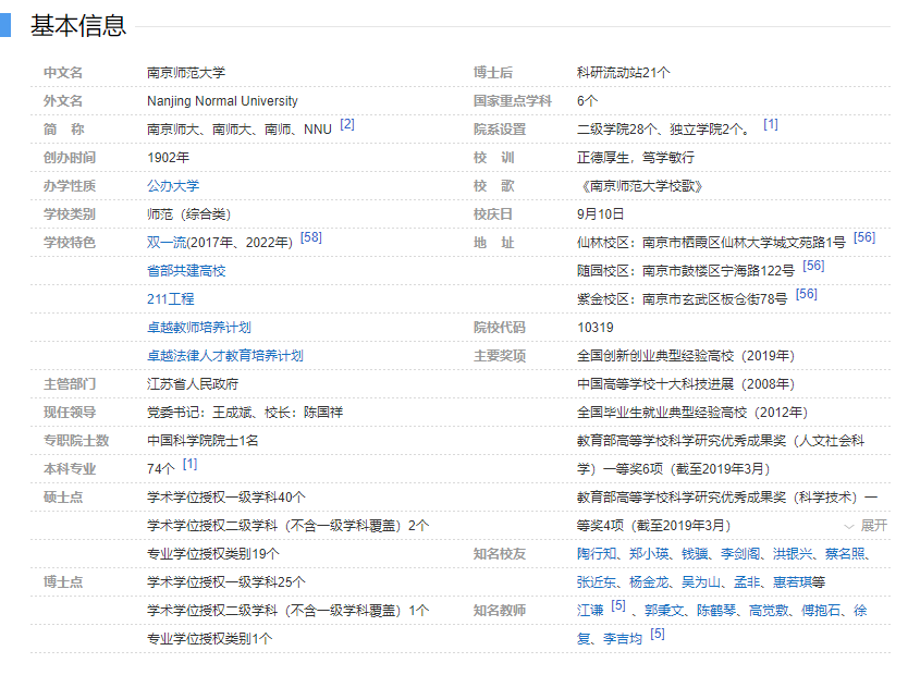 南京师范大学是国家“双一流”建设高校和江苏高水平大学建设高校。学校的主源可追溯到1902年创办的三江师范学堂,该学堂是中国高等师范教育的发祥地之一。后历经两江优级师范学堂、南京高等师范学校、国立东南大学、国立第四中山大学、江苏大学、国立中央大学、国立南京大学等时期;其另一源头为1888年创办的汇文书院,后发展为金陵大学,1951年与金陵女子文理学院(曾称金陵女子大学)合并,成立公立金陵大学。1952年全国高校院系调整,在原南京大学、公立金陵大学等有关院系的基础上组建南京师范学院,校址设在原金陵女子大学校址。1984年改办成南京师范大学。1996年进入国家“211工程”高校行列。2000年南京动力高等专科学校并入。2015年成为江苏省与教育部共建高校。2017年入选国家首轮“双一流”建设高校。2018年成为教育部与江苏省共建“双一流”建设高校。2022年入选国家第二轮“双一流”建设高校。目前,学校正在着力建设“有国际影响的高水平大学”。 南京师范大学作为一所百年老校,名家大师辈出,文化底蕴深厚。李瑞清、江谦、柳诒徵、郭秉文、李叔同、张士一、陶行知、陈鹤琴、吴贻芳、孟宪承、杨贤江、徐悲鸿、高觉敷、罗家伦、潘玉良、张大千、唐圭璋、傅抱石、陈邦杰、陈洪、吴作人、李旭旦、孙望等诸多蜚声海内外的专家学者曾在此主政或执教。目前更有一大批国内外知名的专家学者在此潜心耕耘,著书立说,培育后学。经过一代又一代南师人薪火相继、身教言传,历史性地生成了“严谨朴实”的学术品格,育就了“以人为本”的厚生传统,砥砺出“团结奋进”的拼搏意识,塑造了“追求卓越”的创新精神。学校以“正德厚生、笃学敏行”为校训,形成了“严谨、朴实、奋发、奉献”的优良校风。 南京师范大学拥有仙林、随园、紫金三个校区,随园校区有着“东方最美丽的校园”之美誉。学校占地面积2179633平方米,现有校舍总建筑面积932076.19平方米。设有二级学院28个、独立学院2个。学校共有在职教职工3271人,专任教师2170人,专任教师中正高级职称654人,副高级职称748人;中科院院士1人,国家级有突出贡献专家10名,“百千万人才工程”国家级人选11名,教育部创新团队1个,教育部重大人才工程入选者13人,国家重大人才计划A类特聘专家4名、青年人才4名,国家重大人才计划B类领军人才7名、青年拔尖人才4名,国家杰出青年科学基金获得者7名,国家优秀青年科学基金获得者10名,国家级教学名师4人,国务院学科评议组成员5人,教育部高校教学指导委员会委员30人,教育部“新世纪优秀人才支持计划”人选15人,科技部创新人才推进计划领军人才2人,中科院“百人计划”人选2人,全国高校辅导员年度人物1人,国家级教学团队4个,“全国高校黄大年式教师团队”2个。共有在校普通本科生18723人,在校研究生13448人(其中学术型7329人,专业型6119人;博士研究生1570人,硕士研究生11878人)。成人高等教育在籍生10795人。图书馆为全国古籍重点保护单位,总建筑面积39705平方米,馆藏纸本文献总量385.93万册,电子数据库166个。校园内有2处“全国重点文物保护单位”。 南京师范大学充分发挥学科建设的龙头作用,目前拥有国家“双一流”建设学科1个(地理学)、国家重点学科6个、国家重点(培育)学科3个,江苏高校优势学科14个,“十四五”江苏省重点学科9个,马克思主义学院入选全国第三批重点马院。2011年成立研究生院。拥有博士学位授权一级学科25个、博士学位授权二级学科专业(不含一级学科覆盖)1个,硕士学位授权一级学科41个,博士专业学位类别1个,硕士专业学位类别25个,2020年本科招生专业(类)49个,共涵盖74个专业,博士后科研流动站22个。学科已涉及哲、经、法、教、文、史、理、工、农、医、管、艺等门类。在全国第四轮学科评估中,马克思主义理论、教育学获评A等级;中国语言文学、外国语言文学、地理学、美术学获评A-等级,工程学、化学、植物学与动物学、农业科学、材料科学、地球科学、环境科学/生态学、数学、社会科学总论、计算机科学等10个学科跻身ESI全球前1%。 南京师范大学不断推进“厚生育才”战略,深化教育教学改革,提高人才培养质量。拥有国家精品课程13门、国家级精品视频公开课8门、国家级精品资源共享课15门、国家精品在线开放课程9门、国家虚拟仿真实验教学一流课程4门、国家线下一流课程3门、国家线上线下混合式一流课程4门、教育部课程思政示范课程2门、课程思政教学名师和团队2个、教育部双语教学示范课程7门、教育部来华留学英语授课品牌课程3门、全国高校职业发展与就业指导示范课程1门,教育部“马工程”重点教材相应课程“精彩一课”11门,国家特色专业8个,国家一流专业建设点29个,“十二五”本科国家级规划教材21本(部),国家级教学成果奖22项,首届全国教材建设奖优秀教材高等教育类3项,基础教育类13项,教育部新工科研究与实践项目1项,教育部新文科研究与改革实践项目3项,中国学位与研究生教育学会研究生教育成果奖3项,国家级人才培养模式创新实验区3个,国家体育与艺术师资培养培训基地1个,全国教育硕士专业学位研究生联合培养示范基地3个,教育部专业综合改革试点项目1个,教育部卓越教师培养计划改革项目2个,教育部高素质复合型硕士层次高中教师培养试点专业