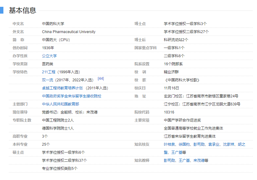 中国药科大学坐落于古都南京,始建于1936年,是我国历史上第一所由国家创办的药学高等学府。学校为教育部直属、国家“211工程”和“985工程优势学科创新平台”建设高校,是一所以药学为特色的多科性、研究型大学,其中以药学、中药学学科为龙头的药学学科群建设始终保持国内领先水平,素有“中国生物医药人才摇篮”的美誉。2017年,成为国家“双一流”建设高校。 历史沿革 学校前身为国立药学专科学校(本科,四年制)。建校初期,抗战爆发,学校初迁汉口,复迁重庆,精研学术,哺育英华。1946年回迁南京。1952年,齐鲁大学药学系和东吴大学药学专修科并入学校,成立华东药学院。1955年开始招收研究生。1956年更名为南京药学院。1986年与筹建中的南京中药学院合并,成立中国药科大学。1996年进入国家“211工程”重点建设的百所高校行列。2000年,学校由国家药品监督管理局整体划转教育部管理。2001年,江苏省药科学校整体并入学校。80多年来,学校秉承“精业济群”的校训精神,兴药为民、荣校报国、存心以仁、任事以诚,积淀了深厚的文化底蕴,铸就了独特的治校品格,努力成为“全球最受尊敬的药学高等学府”。 办学规模 学校现有全日制在校生18802人,其中研究生6894人、留学生504人。建有玄武门、江宁2个校区,占地2100余亩。建筑面积66.5万平方米,其中教学科研及辅助用房32.2万平方米、行政办公用房2.6万平方米、学生宿舍22.6万平方米。图书馆藏书百万余册。 师资力量 学校师资力量雄厚,荟萃了众多知名的药学专家。在职教职工1799人,其中专任教师1077人,正高级专业技术职务251人,副高级专业技术职务519人。现有中国工程院院士1人、德国科学院院士1人,国家级高层次人才13人次,国家级高层次青年人才26人次,享受国务院政府特殊津贴17人,全国高校黄大年式教师团队1个,国家级教学名师、全国优秀教师2人,以及一大批国家级和省部级人才项目入选者。现有国家和省级创新团队21个,其中国家自然科学基金创新研究群体1个、教育部创新团队2个。 学科专业 学校现有3个一级学科博士学位授权点(药学、中药学、生物学),1个博士专业学位授权点(生物与医药),8个一级学科硕士学位授权点(药学、中药学、生物学、化学、基础医学、公共卫生与预防医学、生物医学工程、公共管理),5个硕士专业学位授权点(药学、中药学、生物与医药、应用统计、公共管理)。设有药学、中药学2个博士后流动站,可在3个一级学科、23个二级学科接收博士后人员。药学一级学科为国家一级重点学科,所覆盖的药物化学、药剂学、生药学、药物分析学、微生物与生化药学、药理学等6个二级学科均为国家重点学科。中药学学科入选国家“双一流”建设学科。药学、生物学学科获“江苏高校优势学科建设工程”三期项目立项建设。基础医学、生物医学工程、环境科学与工程入选“十四五”江苏省重点学科。 学校致力于建设以“大药学+X”为牵引、“新药科”和“大药学”为特征、面向世界一流的“现代药学学科体系2.0”。在全国第四轮学科评估中,药学学科获评A+。中药学学科入选国家“双一流”建设学科。2022年,药理学与毒理学、化学、临床医学、生物与生物化学、材料科学、农业科学6个学科领域的ESI排名进入全球前1%,其中药理学与毒理学学科排名全球前1‰(万分之2.4),位列全球第26位、亚洲高校第1位。在2022 US News 世界大学排行榜中,学校药理学与毒理学学科位列全球第13位、亚洲第1位。在世界大学排名中心(CWUR)学科排行中,学校药物化学学科位列全球第3位。在2021软科中国最好学科排名中,学校药学、中药学学科分别排名国内第1位、第2位,均进入“中国顶尖学科”。 学校下设16个院部,现有31个本科专业(类)。药学、中药学、生物制药、制药工程、临床药学、药物制剂、药物化学、药事管理和中药资源与开发专业被评为国家一流专业建设点;药物分析、海洋药学、环境科学、食品质量与安全、英语、信息管理与信息系统、工商管理、生物技术被评为江苏省一流本科专业建设点;中药学、药物分析专业被评为江苏省课程思政示范专业;药学、中药学、生物制药、药物制剂和药事管理专业入选江苏高校品牌专业建设一期项目。“十三五”以来,获得省级以上专业建设立项或荣誉的专业共19个。药学、临床药学、制药工程、中药学专业通过教育部教育质量评估中心的专业认证,同时制药工程专业通过了中国工程教育专业认证。“基础药学拔尖学生培养基地”获批国家“基础学科拔尖学生培养计划2.0基地”。 科学研究 学校重视基础研究和新药研发,坚持“两手抓、两手硬”,2021年到账科研经费5.4亿元。学校建有“天然药物活性组分与药效”国家重点实验室,设有与临床前创新药物研发各节点相关的国家和省部级重点实验室、技术平台及工程技术中心34个,实现了化学药、中药、生物药三大领域科研平台的全覆盖,为各类新药的研发提供全方位服务。近年来,学校获国家科技进步二等奖4项、国家技术发明二等奖1项,以第一作者或通讯作者单位在顶尖期刊发表高水平研究论文近300篇,获批国家“重大新药创制”科技重大专项项目数稳居全国高校之首。获批牵头主持国家重点研发计划项目7项,其中总经费超过2000万元的重点研发计划项目4项;获批国家自然科学基金项目9