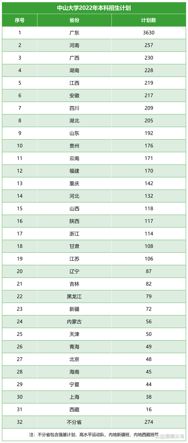 中山大学不仅是华南地区综合实力最强的高校,而且也是本科招生规模最大的双一流院校之一。目前,学校已经公布了2022年高考本科招生计划。 中山大学公布的资料显示,今年面向全国各省区市计划招收全日制普通本科生7730人,涵盖普通类、艺术类、专项计划、强基计划等多个招生类型。 中山大学在广东本地投放了3630个招生名额,其中普通类考生占3086人,综合评价录取考生占495人,艺术类考生31人,高校专项计划考生17人,保送录取运动员1人。 中山大学本科招生计划中的本地生占比在47%左右,这在985高校中绝对名列前茅。985高校都是部属高校,大多数对本地生比例有严格的限制。据统计,在30多所985高校中,本科生本地生占比在30%以上的不超过5所。而除了中山大学以外,广东的另一所985高校华南理工大学本地生占比也是相当的高,甚至达到了50%。 中山大学和中南大学的本科招生规模相对比较接近,但是两校在招生计划的安排上存在着较大差异。中南大学本科招生超过百人的省份多达26个,其中有8个省份招生计划在300人以上,而中山大学招生计划超过百人的省份只有19个,除了广东以外,没有一个省份招生人数在300人以上。中山大学本科招生计划中的主要生源地还有河南和广西,分别投放了257个、230个招生名额。 高校本地生占比和高考报名人数的多少、生源质量的高低等都有很大关系。广东本身人口众多,高考报名人数多年位居全国前三,因此中山大学、华南理工大学虽然是教育部直属高校,但在招生计划的安排上会更大幅度的向本地倾斜。像山东的高考报名人数也很多,山东大学的本地生占比也在30%以上。而像上海、北京这些高考报名人数相对较少的省份,部属高校本地生占比是很低的,一般在10%—20%左右。 去年高考,中山大学几乎把所有专业打包为大类进行招生,结果某些专业大类招生爆冷,像数学类(数学实验班)去年在陕西录取的最低分仅为499分,物理学类(物理实验班)在陕西录取的最低分只有444分。 而今年中山大学在招生专业的安排上有很大的变化,明确按院系专业(类)招生的,高考录取确定主修专业,大一至大四均可申请转专业,还可进行多种微专业、辅修专业、辅修学位、交叉专业学习。 分校区来看,珠海校区专业往年的录取分数线一般都要低于广州和深圳校区。中山大学普通类本科招生专业中,临床医学(深圳)、计算机类(广州)、临床医学(广州)、航空航天类、电子信息类(广州)、电子信息类(深圳)等6个专业在广东招生计划超百人,比不少省份总的招生人数还要多。 |