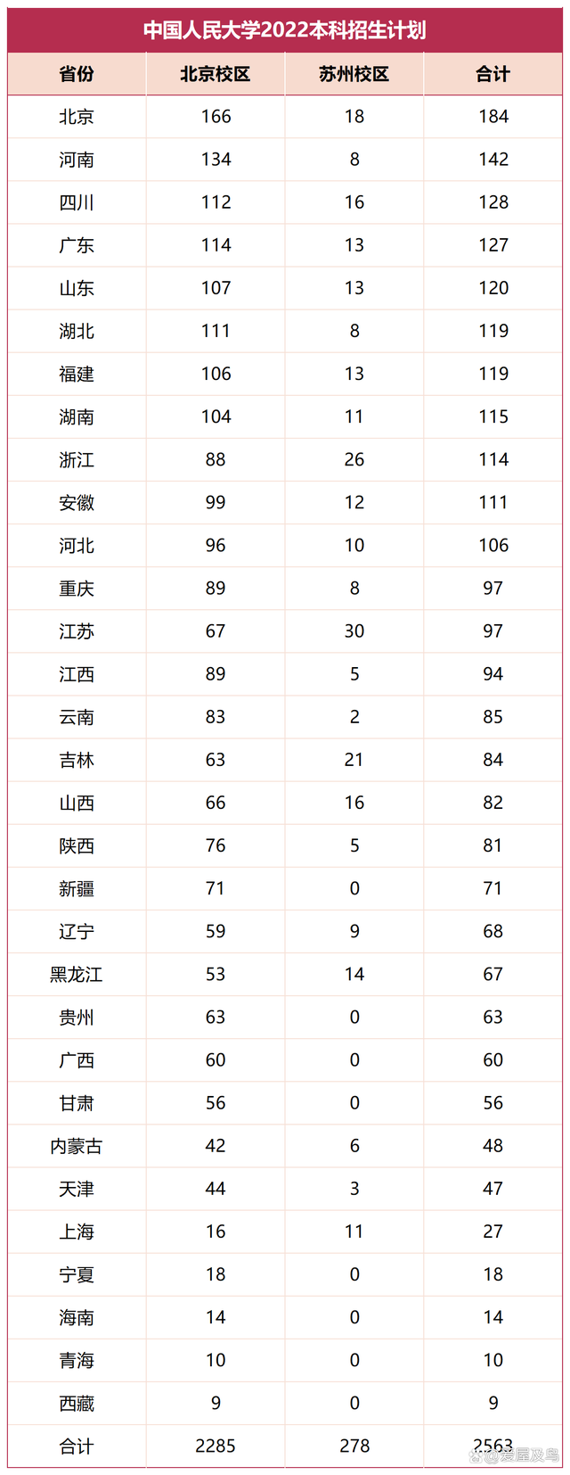 中国人民大学是一所文科院校,在经济学、法学、新闻传播学等人文社科领域实力雄厚且具有较高知名度。目前学校现拥有理论经济学、政治学、社会学、统计学、工商管理等14个双一流建设学科,双一流学科数位列全国高校第七位。人民大学今年的本科招生情况如何呢?下面就一起来了解一下吧。 中国人民大学现有两个校区,即北京中关村校区和苏州校区,其中苏州校区开设的专业均为中外合作办学专业。这两个校区的办学规模都不是很大,再加上属于研究型院校,因此每年投放的本科招生计划少得可怜,只有2000多人。 学校发布的2022本科招生计划显示,面向全国31个省份计划招收本科生2500余人,其中北京中关村校区占2285人、苏州校区仅占278人,涵盖普通类、艺术类、专项计划等招生类型。具体来看,人民大学在北京招生人数最多,共计投放了184个招生名额,其中北京校区166人、苏州校区18人,不过本地生占比只有7%,这个比例在985高校中是相当低的。 中国人民大学虽然本科招生规模不大,但招生计划超过100人的省份多达11个,除了北京以外,招生人数较多的地区还有河南(142人)、四川(128人)、广东(127人)、山东(120人)等。中国人民大学是教育部直属高校,因此在招生计划的安排上,对本地生比例有严格限制,各个省份分得的招生名额相对比较均匀、合理,并未出现招生计划差距特别悬殊的情况。 有意思的是,中国人民大学身处华北地区,但招生超过100人的地区却大多都是南方省份,紧邻北京的河北仅分得了106个招生名额,还不如在福建、湖南投放的招生计划多。人民大学在东北三省投放的招生计划均未超过百人,其中在吉林投放了84个招生名额,在辽宁投放了68个招生名额,在黑龙江投放了67个招生名额。 中国人民大学在江苏设有苏州校区,但苏州校区招生规模极小,并未给江苏带来庞大的招生计划。人民大学今年在江苏共计计划投放97个招生名额,其中北京校区占67人、苏州校区占30人。 中国人民大学目前在北京还有一个在建的通州校区,一期计划明年秋季建成投入使用,届时学校的办学空间将得到极大扩展,办学条件也将得到极大改善,本科招生规模或将进一步扩大。 |