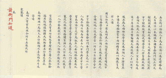 湖广总督张之洞上奏《设立自强学堂片》,光绪帝朱批有“该衙门知道”的奏折