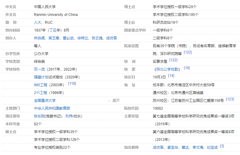 中国人民大学(Renmin University of China),简称“人大”,是教育部直属高校,教育部与北京市共建,位列国家“双一流”、“211工程”、“985工程”,为世界大学联盟、国际应用科技开发协作网、亚太国际教育协会、京港大学联盟成员,入选国家“强基计划”、“111计划”、“2011计划”、卓越法律人才教育培养计划、卓越农林人才教育培养计划、国家建设高水平大学公派研究生项目、新工科研究与实践项目、中国政府奖学金来华留学生接收院校,是一所以人文社会科学为主的综合性研究型全国重点大学。