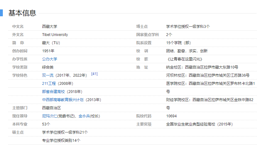 西藏大学是西藏自治区所属综合性大学,是国家“211工程”“双一流”建设高校,2013年列入“中西部高等教育振兴计划”,2018年成为教育部与西藏自治区人民政府合建高校。 学校办学历史可追溯到1951年进藏部队创办的藏文干部训练班,历经西藏军区干部学校、西藏地方干部学校、西藏行政干部学校等发展阶段。1965年、1975年,为满足百万翻身农奴学习文化,建设社会主义新西藏的需要,学校历经西藏师范学校、西藏师范学院发展阶段,开创了西藏师范教育的先河。为适应西藏地区经济社会快速发展对人才的需要,经教育部批准,1985年7月学校正式更名为西藏大学。1999年以来,西藏自治区艺术学校、西藏医学高等专科学校和西藏民族学院医疗系、西藏自治区财经学校、西藏农牧学院先后并入西藏大学,步入了创办具有民族区域特色综合性大学的新阶段。2016年,西藏大学农牧学院单独设置为西藏农牧学院。 学校有纳金校区、河坝林校区、罗布林卡医学院校区和罗布林卡财经学院校区四个校区,占地面积1400余亩,建筑面积47.07万平方米,教育城校区正在规划建设中。现有文学院、理学院、工学院、医学院、艺术学院、经济与管理学院、旅游与外语学院、政法学院、教育学院、财经学院、信息科学技术学院、马克思主义学院、国家开放大学西藏分部、继续教育学院、交流合作处(留学生部)15个学院(部)。教学科研仪器设备总值6.02亿元。图书总藏量 115.59万册,收藏了 1000 多年前吐蕃时期藏文写本“菩日文献”,其中,十世纪写本《大般若波罗蜜多经》《大般若波罗蜜多经两万五千颂》分别入选第三批、第五批《国家珍贵古籍名录》,《“菩日文献”精选影印本》被中国藏学研究中心列入改革开放 40 周年重要成果。电子图书57万余种。 学校在编在职教职工1158人,其中专任教师和其他师资845人。专任教师和其他师资中具有高级职称386人,占45.7%;具有硕士研究生以上学历630人,占74.6%。有高层次人才63人次,其中国家级高层次人才43人次,自治区级高层次人才20人次。 学校有各类在校生2.4万余人,其中普通本专科学生10341人,博士研究生213人,硕士研究生1878人,各类成人学生1.2万余人。 学校有民族学、中国语言文学、生态学3个一级学科博士学位授权点,21个一级学科硕士学位授权点和14个专业硕士学位授权点。有生态学、中国语言文学(藏语言文学)2个国家级重点学科,14个自治区级重点学科,生态学入选世界一流学科建设行列。 学校有53个本科专业,涵盖经济学、法学、教育学、文学、历史学、理学、工学、医学、管理学和艺术学10个学科门类。法学、中国少数民族语言文学、计算机科学与技术、美术学、经济学、物理学、环境科学7个专业入选国家级一流本科专业建设点,12个专业入选省级一流本科专业建设点。《中学英语教学法》《人力资源管理》2门课程入选国家级一流本科课程,20门课程入选自治区级一流本科课程。《马克思主义祖国观民族观宗教观文化观教育概论》为国家精品课程,自治区精品课程20门。《人力资源管理》为国家双语教学示范课程。藏语言文学、计算机及藏文信息技术专业2个国家级教学团队,数学与应用数学、临床医学、音乐学、美术学4个国家特色专业建设点,“信息技术实验”国家级实验教学示范中心,国家大学生校外实践教育基地1个,自治区级教学团队6个,自治区特色专业5个。有教育部高等学校教学指导**会成员13名。近年来,获得《整体推进马克思主义“四观”教育 培养“靠得住”的高素质人才》和《计算机及藏文信息处理人才培养体系的探索与实践》2项国家级教学成果奖,35项自治区级教学成果奖,入选“全国首批创新创业教育示范高校”。承担国家卓越医生教育培养计划项目1项,国家专业综合改革试点项目1项,自治区级人才培养模式改革项目5项,自治区专业综合改革试点4个,自治区级教改项目80项,国家大学生创新创业训练计划项目451项,自治区大学生创新创业训练计划项目879项。 学校拥有教育部人文社会科学重点研究基地、教育部工程研究中心、科技部创新人才培养示范基地、国家发改委国家地方联合工程研究中心、教育部重点实验室、中国科学院和自治区共建重点实验室、国家民委“一带一路”国别和区域研究中心、教育部高校国别和区域研究备案中心、国家知识产权局技术与创新支持中心(TISC)等国家级重要科研平台。有1个国家陆地生态系统定位观测研究站——西藏雅尼湿地生态系统定位观测研究站,2个教育部野外观测站——那曲麦地卡湿地生态站、波密地质灾害野外科学观测研究站,3个“区部共建”协同创新中心——中国少数民族社会经济发展协同创新中心、西藏信息化省部共建协同创新中心、环喜马拉雅人类活动与区域发展协同创新中心,1个自治区高校哲学社会科学研究基地——西藏大学经济文化研究中心,4个自治区重点实验室——藏文信息技术实验室、自然语言处理实验室、现代教育技术综合实验室、宇宙线开放实验室,11个自治区高等学校重点实验室,3个自治区高等学校科研创新团队——西藏经济研究科研创新团队、藏族历史文化研究科研创新团队、高原生物多样性研究科研创新团队,2个省部级工程研究中心——藏文信息技术研究中心-国家地方联合工程中心、藏文信息技术研究中心-教育部工