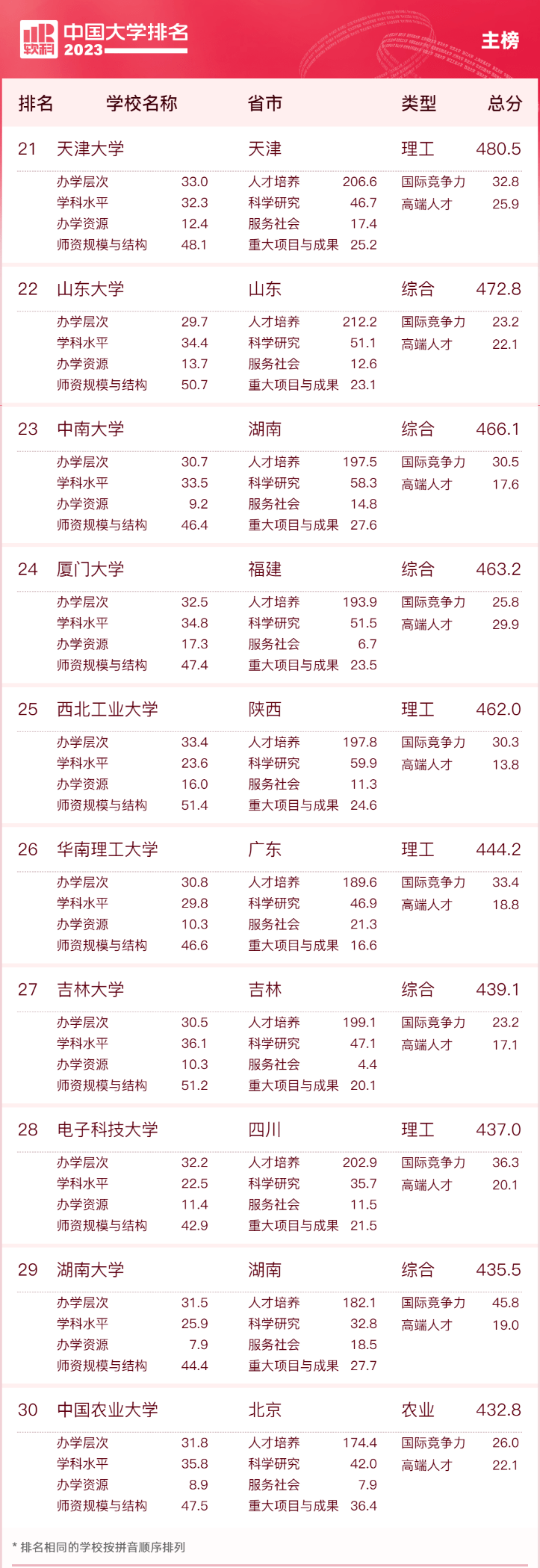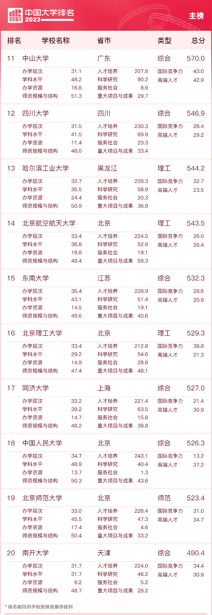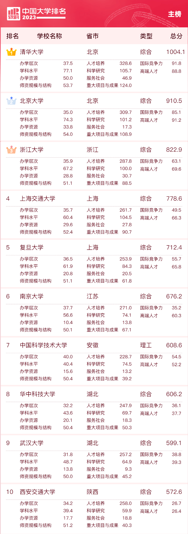 高等教育专业评价机构软科今日正式发布“2023软科中国大学排名”。清华大学、北京大学、浙江大学蝉联主榜(即综合性大学排名)前三位。北京协和医学院位列医药类大学排名第一,上海财经大学位居财经类大学排名榜首,北京外国语大学名列语言类大学排名第一,中国政法大学位列政法类大学排名榜首,中央民族大学占据民族类大学排名首位,上海体育学院领跑体育类大学排名,香港中文大学(深圳)在中国合作办学大学排名中夺冠。 “软科中国大学排名”前身是“软科中国最好大学排名”,自2015年首次发布以来,以专业、客观、透明的优势赢得了高等教育领域内外的广泛关注和认可,已经成为具有重要社会影响力和权威参考价值的中国大学排名领先品牌。软科中国大学排名以服务中国高等教育发展和进步为导向,坚持贯彻国家高等教育改革和教育评价的方针、政策,用中国标准评价中国高校。 “2023软科中国大学排名”的对象是中国1000多所本科层次的高校,为恰当反映高校在学校性质和学校类型上的差异、确保排名的公平性,软科将高校划分为综合性大学、7类单科性大学、4类非公办大学,采用差异化的指标体系分别排名。 “软科中国大学排名”的评价体系设置了十大评价模块,细分36个评价维度,内嵌100项评价指标,涉及345个评价变量,是对中国大学办学水平的立体化监测式评价。软科创始人程莹介绍:“软科中国大学排名的导向是反映当前中国高校的核心使命,回应外部群体对大学的价值期待,重视人才培养、强调服务国家是软科排名指标体系的两个最重要特点。” 为更加全面地反映我国不同地区、不同类型高校为国家和区域社会经济发展所做的贡献,软科今年对中国大学排名的指标体系和内涵进行了进一步丰富和完善:将国家社会科学基金的各类专项工程、后期资助项目、中华学术外译项目等纳入科研项目的评价范围;在“自科面上青年项目”和“社科一般青年项目”指标中分别增加国家自然科学基金地区项目和国家社会科学基金西部项目;在“学科水平”模块新增“双一流学科数”和“双一流学科精度”指标;此外,还新增了国家产教融合创新平台、教育部哲学社会科学实验室、全国教材建设奖等多个变量,评价变量总数比2022年增加了25个。 传统名校地位稳固 百强高校再增2所“双一流” 2023软科中国大学排名(主榜)的上榜高校共有590所,清华大学、北京大学、浙江大学连续9年蝉联全国三甲,实力强劲。上海交通大学、复旦大学位列全国前五。其他位列全国前十名的大学依次为南京大学(第六)、中国科学技术大学(第七)、华中科技大学(第八)、武汉大学(第九)、西安交通大学(第十)。 “双一流”高校在排名中占绝对优势地位,百强高校中有90所为“双一流”高校。第二轮“双一流”新晋选手湘潭大学较2022年上升14名,位列全国第92名,大连海事大学上升11名,排在第99名。至此,“双一流”高校在百强榜单中再增2所。 10所非“双一流”高校凭借强劲的综合实力跻身百强,其中深圳大学(68名)、浙江工业大学(70名)、江苏大学(78名)、扬州大学(81名)、南京工业大学(85名)位列前五。 2023软科中国大学排名(主榜) |