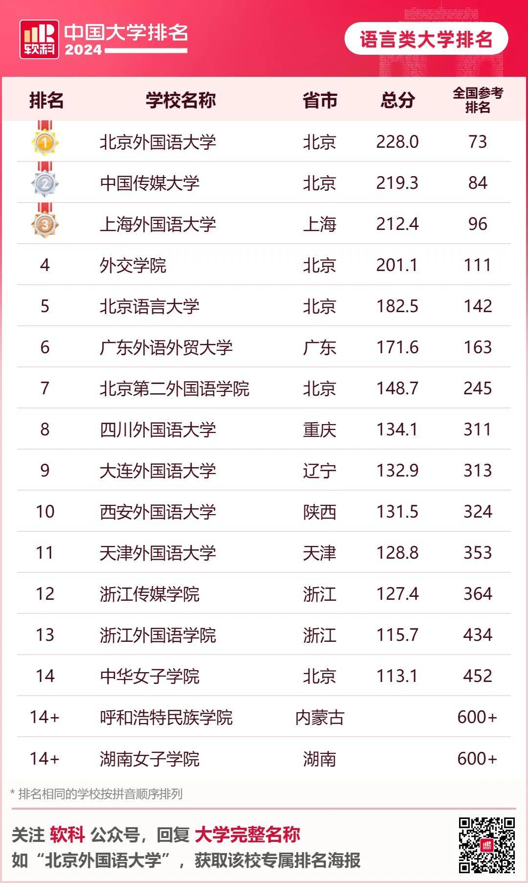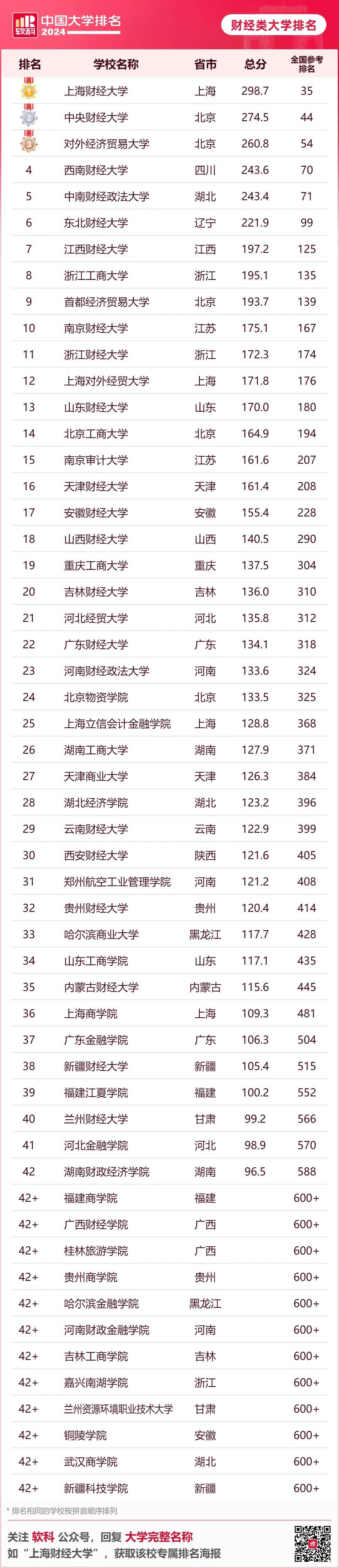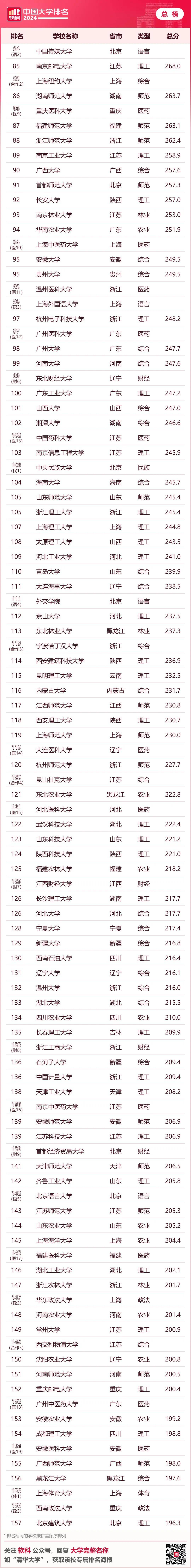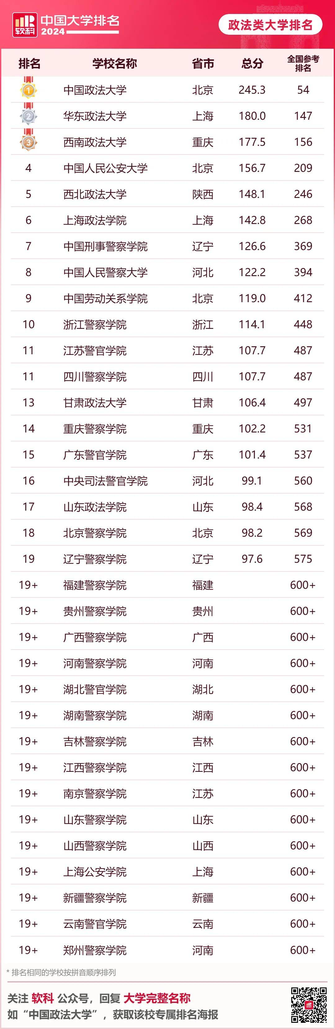 · 软科单科性大学排名· 2024软科中国医药类大学排名的上榜高校有84所,北京协和医学院、首都医科大学、南方医科大学位列前三。 2024软科中国财经类大学排名的上榜高校有54所,上海财经大学、中央财经大学、对外经济贸易大学位列前三。 2024软科中国语言类大学排名的上榜高校有16所,北京外国语大学、中国传媒大学、上海外国语大学位列前三。 2024软科中国政法类大学排名的上榜高校有34所,中国政法大学、华东政法大学、西南政法大学位列前三。 2024软科中国民族类大学排名的上榜高校有13所,中央民族大学、中南民族大学、西南民族大学位列前三。 2024软科中国体育类大学排名的上榜高校有14所,上海体育大学、北京体育大学、首都体育学院位列前三。