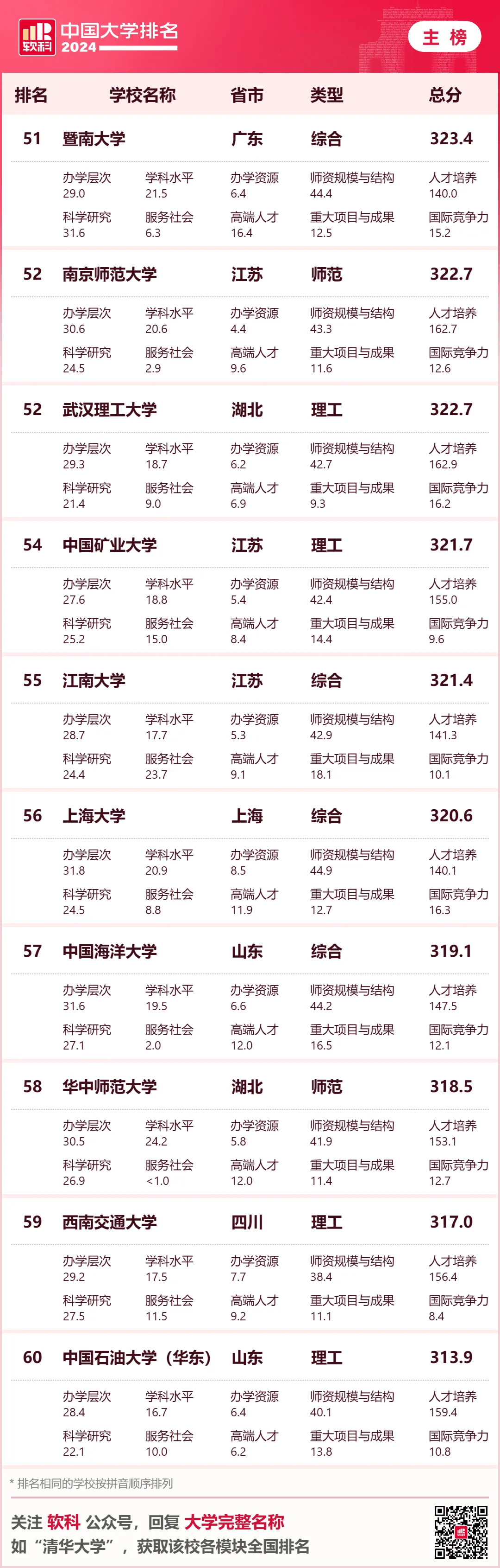 2024软科中国大学排名(主榜)的上榜高校共有594所,清华大学、北京大学、浙江大学连续10年蝉联全国三甲,实力强劲。上海交通大学、复旦大学位列全国前五。其他位列全国前十名的大学依次为南京大学(第六)、中国科学技术大学(第七)、华中科技大学(第八)、武汉大学(第九)、西安交通大学(第十)。 “软科中国大学排名”前身是“软科中国最好大学排名”,自2015年首次发布以来,以专业、客观、透明的优势赢得了高等教育领域内外的广泛关注和认可,已经成为具有重要社会影响力和权威参考价值的中国大学排名领先品牌。软科中国大学排名以服务中国高等教育发展和进步为导向,坚持贯彻国家高等教育改革和教育评价的方针、政策,用中国标准评价中国高校。