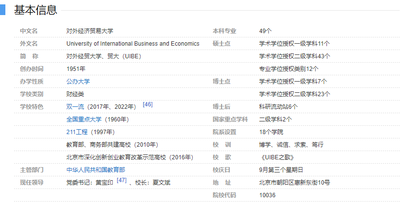 对外经济贸易大学是教育部直属的全国重点大学,首批“211 工程”和首批“双一流”建设高校,坐落在首都北京朝阳区。学校校园规划精致,环境优雅,是中国社会主义经济建设事业人才培养和科学研究的重要基地之一。 学校前身为高级商业干部学校,创建于1951年,受中央贸易部和教育部双重领导。1952年,中央贸易部撤销,学校划归对外贸易部,受对外贸易部和教育部双重领导。1953年,学校更名为北京对外贸易专科学校,由教育部委托对外贸易部领导。1954年,中国人民大学贸易系对外贸易专业并入北京对外贸易专科学校,以北京对外贸易专科学校为基础成立北京对外贸易学院。1984年,学校更名为对外经济贸易大学。2000 年6月,原中国金融学院与原对外经济贸易大学合并成立新的对外经济贸易大学,划归教育部直属。2010 年12月,教育部与商务部正式签署协议,共建对外经济贸易大学。学校现任党委书记黄宝印,校长夏文斌。 历经几代师生员工的艰苦创业和努力奋斗,对外经济贸易大学已经发展成为一所拥有经、管、法、文、理、工六大门类,以国际经济与贸易、法学(国际经济法)、金融学、工商管理、外语(商务外语)等优势专业为学科特色的多科性财经外语类大学。目前,学校下设研究生院及18个学院,并设有体育部;拥有国家级重点学科2个,国家级人文社会科学重点研究基地1个,教育部战略研究(培育)基地1个,教育战略与规划研究中心1 个,“高等学校学科创新引智计划”基地2个,文化部文化和旅游研究基地1个,北京市高精尖学科1个,北京市重点学科7个,北京市哲学社会科学研究基地1个,首都高端智库1个,博士后流动站6个,一级学科博士点7 个,一级学科硕士点11个,专业硕士学位授权点12 个,本科专业49个。 学校现有教职工1600余人,其中专任教师1000余人,学校还聘请一定数量的兼职教师及外国专家。这是一处群英荟萃之地,老教授中名家耀眼,中青年教师里新秀辈出。大批获得政府特殊津贴、受聘担任政府学术机构成员的专家学者工作在教学科研第一线;大部分中青年教师在国外留学或进修过,教学科研水平高,许多人被评为省部级学科带头人和骨干教师,入选国家优秀人才培养工程。 学校现有在校学生1.6万余人,其中本科生8500余人,研究生5600余人,来华留学学历生2300余人。学校培养的学生一直以专业知识和技能扎实、外语娴熟、思维活跃、实践能力强而受到社会的普遍欢迎,毕业生遍布全国各地的外贸、金融、会计、教育科研等行业领域以及国家机关、中国驻外商务机构,为我国经济与社会发展,尤其是经贸事业的发展发挥着重要的作用。 学校的学术研究在我国对外经贸科研领域占有重要地位,设有140余个研究单位,其中中国WTO 研究院是全国唯一的研究世界贸易组织的国家级人文社科重点研究基地。学校图书馆文献总量190余万册(件)。学校主办并公开发行多种学术刊物,其中《国际贸易问题》、《国际商务——对外经济贸易大学学报》、《日语学习与研究》、《Journal of WTO and China》(WTO与中国)等享有较高的学术地位。学校出版社每年出书百余种,在高校中享有较高声誉。学校也是国家培训高级经济管理干部的基地之一,设有政府委托或与外国合办的多个高级在职培训机构。 学校于1989 年11 月在国内率先成立了校董会。李岚清为首任校董会主席,荣毅仁、霍英东等任名誉主席,吴仪为第二任校董会主席。2011 年9 月,校董会第三届会议选举施建军为第三任校董会主席,石广生、刘鸿儒、陈元为荣誉主席。校董会的建立,对于学校的建设发展发挥了重要作用。 学校在发展过程中受到海内外广泛关注和支持:政府机构、企业家、财团、大公司等纷纷向学校捐资设立基金或奖学金,许多国际著名的跨国企业成为学校的赞助团体。目前,社会力量在学校设立的奖学金、奖教金等20余项,院系级基金则更多。学校与美、英、法、德、日、俄、意、澳等51 个国家和地区的280余所著名大学和研究机构建立合作交流关系,不断开展的对外交流与合作,使对外经济贸易大学面向世界办学的特色更加鲜明。 面对新时期我国全面实现小康社会建设目标,加快社会主义现代化建设的新形势,学校倡导追求卓越、创造精品的理念,坚持办精品大学、控制办学规模,办特色大学,走内涵发展、特色发展和现代化发展之路,加强国际化建设,着力培养复合型人才,将建设特色鲜明世界一流大学作为长期愿景和历史使命。 ( 以上数据统计截至2020年9月30日) |