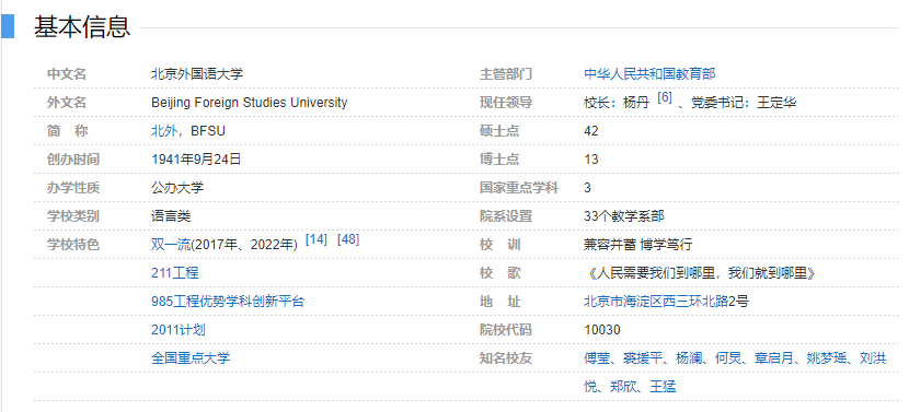 北京外国语大学坐落在北京市海淀区西三环北路,在三环路两侧分设东、西两个校区,是教育部直属、首批“211工程”高校、“985”优势学科创新平台高校、首批“双一流”建设高校。 北外是中国共产党创办的第一所外国语高等学校,前身是1941年成立于延安的中国抗日军政大学三分校俄文大队,后发展为延安外国语学校,建校始隶属于党中央领导。新中国成立后,学校归外交部领导,1954年更名为北京外国语学院,1959年与北京俄语学院合并组建新的北京外国语学院。1980年后直属教育部领导,1994年正式更名为北京外国语大学。 北外获批开设101种外国语言,欧洲语种群和亚非语种群是目前我国覆盖面最大的非通用语建设基地,是教育部第一批特色专业建设点。学校形成了以外国语言文学学科为主体,文、法、经、管等多学科协调发展的格局。按照时间先后,学校开设语种包括俄语、英语、法语、德语、西班牙语、波兰语、捷克语、罗马尼亚语、日语、阿拉伯语、柬埔寨语、老挝语、僧伽罗语、马来语、瑞典语、葡萄牙语、匈牙利语、阿尔巴尼亚语、保加利亚语、斯瓦希里语、缅甸语、印尼语、意大利语、克罗地亚语、塞尔维亚语、豪萨语、越南语、泰语、土耳其语、朝鲜语、斯洛伐克语、芬兰语、乌克兰语、荷兰语、挪威语、冰岛语、丹麦语、希腊语、菲律宾语、印地语、乌尔都语、希伯来语、波斯语、斯洛文尼亚语、爱沙尼亚语、拉脱维亚语、立陶宛语、爱尔兰语、马耳他语、孟加拉语、哈萨克语、乌兹别克语、拉丁语、祖鲁语、吉尔吉斯语、普什图语、梵语、巴利语、阿姆哈拉语、尼泊尔语、索马里语、泰米尔语、土库曼语、加泰罗尼亚语、约鲁巴语、蒙古语、亚美尼亚语、马达加斯加语、格鲁吉亚语、阿塞拜疆语、阿非利卡语、马其顿语、塔吉克语、茨瓦纳语、恩得贝莱语、科摩罗语、克里奥尔语、绍纳语、提格雷尼亚语、白俄罗斯语、毛利语、汤加语、萨摩亚语、库尔德语、比斯拉马语、达里语、德顿语、迪维希语、斐济语、库克群岛毛利语、隆迪语、卢森堡语、卢旺达语、纽埃语、皮金语、切瓦语、塞苏陀语、桑戈语、塔玛齐格特语、爪哇语、旁遮普语。学校秉承延安精神,坚持服务国家战略,目前已开齐与中国建交国家的官方用语。 北外现有33个教学科研单位,近年来,学校与英国诺丁汉大学合作成立国际研究生院,陆续成立许国璋语言高等研究院、王佐良外国文学高等研究院、区域与全球治理高等研究院、比较文明与人文交流高等研究院等众多特色研究机构;大力推进人才培养模式改革,建立北外学院、国际组织学院、国际教育学院。在原亚非学院基础上,扩建为亚洲学院、非洲学院。学校拥有教育部人文社会科学重点研究基地:中国外语与教育研究中心,国家语委科研中心:国家语言能力发展研究中心。4个教育部区域和国别研究培育基地(中东欧研究中心、日本研究中心、英国研究中心、加拿大研究中心)以及37个教育部备案国别和区域研究中心。3个教育部人文交流研究中心:中国-印尼人文交流研究中心、中法人文交流研究中心、中德人文交流研究中心。学校编辑出版《外语教学与研究》《外国文学》《国际论坛》《国际汉学》四种CSSCI来源刊物,一种CSSCI扩展版来源期刊《外语教育研究前沿》,出版《中国俄语教学》《中国应用语言学(英文)》《国际汉语教育》《英语学习》《欧亚人文研究》《德语人文研究》《法语国家与地区研究》《区域与全球发展》《青少年法制教育》等刊物。学校有全国最大的外语类书籍、音像和电子产品出版基地:外语教学与研究出版社。 北外开设本科专业121个,其中44个专业是全国唯一专业点。学校现有4个国家重点学科(含培育学科),7个北京市重点学科。拥有一级学科博士点2个(外国语言文学、管理科学与工程),一级学科学术型硕士点11个(法学、政治学、马克思主义理论、应用经济学、中国语言文学、外国语言文学、新闻传播学、管理科学与工程、工商管理、教育学、世界史),专业硕士点8个(金融、国际商务、汉语国际教育、翻译、新闻与传播、法律、会计、工商管理硕士),涵盖文学、经济学、管理学、法学、教育学、历史学六大学科门类。在2017年全国第四轮学科评估结果中,学校外国语言文学一级学科评级为A+,位居全国榜首。2018年“QS世界大学学科排名”发布,学校语言学、现代语言2门学科再次进入全球前100强,居国内同类院校之首。学校本科在校生5600人,研究生(硕士、博士)3100人,留学生1600人。 北外注重创新人才管理机制,全面提升师资队伍水平,现有在职在编教职工1200余人,另有来自60个国家和地区的外籍教师近200人。学校拥有国家级突出贡献的中青年专家、国家“万人计划”哲学社会科学领军人才、国家“万人计划”教学名师、国家百万千万人才工程、国家“四个一批”人才、青年“长江学者”等高水平师资。教师中超过90%拥有海外学习经历。中国外语与教育研究中心教师团队入选首批“全国高校黄大年式教师团队”。 北外坚持高端引领、整体推进的国际化办学思路,与世界上91个国家和地区的313所高校和学术机构开展交流,与英国诺丁汉大学、英国伦敦大学亚非学院、法国国立东方语言文化学院、俄罗斯莫斯科国立语言大学、德国哥廷根大学、意大利罗