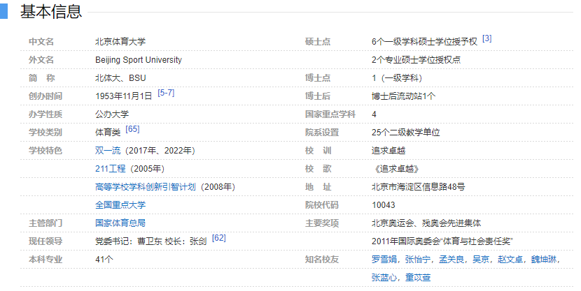 北京体育大学成立于1953年,原名中央体育学院,1956年更名为北京体育学院,1993年更名为北京体育大学,是全国重点院校、国家“211工程”重点建设大学、国家首批“双一流”建设高校,具有光荣的办学历史、深厚的文化底蕴和扎实的办学基础,在国内外享有盛誉,隶属国家体育总局。学校位于海淀区信息路,占地面积75.5万平方米,建筑面积约41万平方米,共拥有室内外训练场馆近100个。 学校现设有体育与健康学部、人文社科学部、奥林匹克运动学部、体育工程学部4个学部,体育与健康学部下设教育学院(体育师范学院)、心理学院等7个学院;人文社科学部下设马克思主义学院、管理学院等8个学院;奥林匹克运动学部下设中国足球运动学院(中国足球教练员学院)、中国篮球运动学院等9个学院(校);体育工程学部下设体育工程学院。中共国家体育总局党校、国家体育总局干部培训中心、国家体育总局教练员学院设在学校。 学校以本科教育为基础、研究生教育为重点,是我国体育院校首批博士学位授予单位之一。现有体育教育、运动训练等41个本科专业,其中国家级一流本科专业建设点9个、省级一流本科专业建设点6个。学科布局涉及教育学、法学、经济学、文学、理学、工学、医学、管理学、艺术学9个学科门类。学校体育学一级学科及所辖全部二级学科为国家重点学科,拥有1个北京市重点二级学科、1个交叉学科北京市重点学科和1个北京高校高精尖建设学科;体育学科整体水平在前3轮全国学科评估中均名列榜首,在第4轮全国学科评估中位列“A+”档次。学校拥有体育学一级学科博士学位授予权及体育学、马克思主义理论、教育学、心理学、临床医学、公共管理6个一级学科硕士学位授予权;设有体育、新闻与传播2个专业硕士学位授权点,以及全国首个体育学博士后科研流动站。 学校现有教育部运动与体质健康重点实验室和国家体育总局体能训练与身体机能恢复重点实验室等7个省部级重点实验室、1个北京市高等学校工程研究中心、2个国家体育总局科研基地、1个体育科学学会培训基地、1个国家级实验教学示范中心、2个北京市高校实验教学示范中心。中国体育战略研究院、冬奥文化研究中心、中华民族传统体育研究院、体育产业发展研究中心入选中国智库索引(CTTI)来源智库。图书馆藏书130余万册。 学校现有各级各类在校学生13000余名,其中本科生9600余名,研究生3000余名。近5年毕业生的一次就业率均超过北京地区高校平均就业率水平。 学校始终牢固树立人才培养的中心地位,坚持世界眼光、国际标准、中国特色、高点定位,坚持教育、训练、科研“三结合”办学模式和办学特色,坚持高端化、贯通化、国际化和协同化“四化”人才培养方法,加强体育与教育、科技、文化深度融合,为体育强国、教育强国和健康中国建设培养输送高素质新型体育人才。建校以来,学校为国家培养了近10万学校体育、竞技体育和体育产业等领域的优秀人才,培养了一大批享誉国内外的优秀体育专家学者、教师、教练员、运动员和管理干部,为中国体育事业、高等教育事业和奥林匹克运动,以及经济社会发展作出了突出贡献,得到了党和国家、社会各界及国际社会的充分肯定,曾荣获中共中央、国务院授予的“北京奥运会、残奥会先进集体”荣誉称号和由国际奥委会授予的“体育与社会责任奖”。学校3任校长钟师统、马启伟、金季春分别荣获国际奥委会“奥林匹克运动银质奖章”、“体育运动学习和研究奖”和“体育与教育奖”。 学校始终坚持面向国家重大战略需求和学科发展前沿,主持国家级科研项目(课题)180余项,其中包括“十五”“十一五”“十二五”国家科技支撑计划项目3项、国家重点研发计划科技冬奥专项3项、主动健康与老龄化科技应对重点专项2项;省部级以上科研获奖270余项,其中国家科学技术进步奖7项。《北京体育大学学报》创刊于1966年,现为北大中文核心期刊、南京大学中国社会科学研究评价中心CSSCI来源期刊、科技部“中国科技核心期刊(人文社会科学)”、中国社科院中国人文社会科学核心期刊、武汉大学RCCSE权威期刊。《体育运动科学(英文)》)(Journal of Science in Sport and Exercise)SSEJ创办于2019年,是由国家体育总局主管、北京体育大学主办的体育科学领域的英文学术期刊。 建校至今,学校已与全球52个国家和地区的157所国(境)外高等院校建立了校际关系,为106个国家培养了留学生15000余名,其中,阿列克·马迪申(Oleg Matytsin)博士2015年当选国际大学生体育联合会主席。学校先后授予克罗地亚前总理、克罗地亚奥委会主席兹拉特科·马泰沙(Zlatko Matesa)博士学位;授予国际奥委会主席罗格(Jacques Rogge)等7位国际著名人士名誉博士学位;授予国际奥委会主席托马斯·巴赫(Thomas Bach),国际滑雪联合会主席吉安·弗兰克·卡斯帕(Gian Franco Kasper),世界冰壶联合会主席凯特·凯斯尼斯(Kate Caithness)等8人“名誉教授”称号,授予国际奥委会高级顾问吉尔伯特·马吕斯·费利(Gilbert Marius Felli)“客座教授”称号,并聘为奥林匹克运动学部“名誉部长”。学校为教育部批准的“中国政府奖学金来华留学生”招收院校、国家建设高水平大学公派研究生项目资助院校和欧盟教育委员会“伊拉斯谟+”师生交流项目资助院校,运动人体科学与竞技体育训练学科创新引智基地