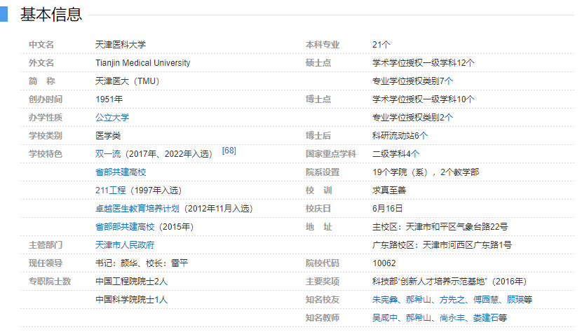 天津医科大学的前身天津医学院创建于1951年,是新中国成立后原国家政务院批准建立的高等医学院校。著名内分泌学家、医学教育家朱宪彝教授为首任校长。1994年6月天津医学院与天津第二医学院正式组建成立天津医科大学。1996年12月成为天津市唯一的国家“211工程”重点建设市属院校,2015年10月成为天津市人民政府、国家卫生健康委员会和教育部共建高校,2017年9月入选国家“世界一流学科建设高校”。 天津医科大学积极投身于我国医学高等教育事业,是国家最早批准试办八年制的2所医学院校之一,也是首批试办七年制的15所院校之一。学校目前有气象台路与广东路2个校区和7所大学医院。现有本科专业22个,设有19个学院(系)和1个独立学院。全日制本科以上在校生10912人,其中本科生5432人,硕士生3641人,博士生948人,学历留学生891人。 包含大学医院在内学校现有各类专业技术人员8666人,其中正高级772人,副高级1518人。拥有国家级人才132人次,其中,中国工程院院士2人、中国科学院院士1人、外籍院士1人;国家杰出青年科学基金获得者12人及优秀青年科学基金获得者9人;国家“万人计划”领军人才8人及青年拔尖人才2人,教育部长江学者15人,国家百千万人才工程人选15人;科技部“973”首席科学家4人;国家人社部有突出贡献专家17人;国家卫生健康委员会有突出贡献中青年专家13人,教育部“新世纪优秀人才支持计划”18人。 现有国家级一流本科专业建设点11个,天津市一流本科专业建设点1个,国家级特色专业5个,国家级专业综合改革试点1个,国家级教学团队2个,天津市级教学团队22个,天津市级教学名师31人,5个教学团队和10名教师获得天津市“在抗击疫情工作中课程思政优秀教学团队和优秀教师”称号;国家级精品课程7门,国家级精品资源共享课5门,国家级精品视频公开课3门,国家级双语示范课程3门,国家级一流本科课程6门,天津市级一流本科建设课程38门;天津市级课程思政示范课程(优秀团队、教学名师)10项;获批首届全国教材建设奖3项,全国教材建设先进个人1名,天津市级课程思政优秀教材6部;国家级人才培养模式创新实验区3个,国家级实验教学示范中心3个,国家级大学生课外创新实践基地2个,国家临床教学培训示范中心2个,医学影像技术专业虚拟教研室入选教育部首批专业建设类虚拟教研室。2002年和2008年,学校以优秀成绩通过教育部本科教学和七年制高等医学教育教学工作水平评估。2012、2013和2014年分别通过教育部护理学专业、口腔医学专业认证和临床医学专业认证。2017年通过教育部本科教学工作审核评估。2009年以来,学校获国家级教学成果一等奖1项、二等奖3项,市级教学成果一等奖12项,二等奖15项。学校于1997年正式成立来华留学生教育管理部门国际医学院,留学生生源来自105个国家,留学生教育规模与质量居全国医学院校前列,现有国家级来华留学生英语授课品牌课程8门,天津市来华留学生英语授课品牌课程25门,“来华留学生临床医学专业全英文教学与质量保障体系的建立与实践”获国家级教学成果一等奖。2010年教育部首个来华留学英语师资培训中心(医学)落户学校。 现有一级学科博士学位授权点10个,博士专业学位授权点2个;一级学科硕士学位授权点11个,硕士专业学位授权点6个。博士后流动站6个。博士生导师431人,硕士生导师1300人。 现有国家重点学科5个,天津市重点学科18个;天津市一流学科4个,天津市特色学科(群)4个;8个学科领域进入全球基本科学指标数据库(ESI)学科排名前1%,其中临床医学进入ESI全球排名前1‰;省部级重点实验室23个,研究所15个,天津医学表观遗传学协同创新中心获批省部共建协同创新中心。现有科技部国际科技合作基地 1个,天津市国际科技合作基地13个,科技部重点领域创新团队1个 ,教育部创新团队2个并获滚动支持。“十二五”以来,学校共承担省部级以上纵向项目2691项,经费超14亿元;获省部级及以上科技奖励131项,包括国家科学技术进步二等奖1项,教育部高等学校科学研究优秀成果奖4项,何梁何利奖1项,天津市科技重大成就奖1项,天津市国际科技合作奖1项,天津市科学技术进步特等奖3项、一等奖22项,天津市自然科学一等奖1项。2016年学校获批科技部“创新人才培养示范基地”。 学校大学医院有国家临床重点专科13个,天津市临床重点专科16个。4所大学医院获批10个国家临床医学研究中心(天津市分中心)、其中肿瘤医院是首批国家恶性肿瘤临床医学研究中心;总医院、肿瘤医院、第二医院、眼科医院、精神卫生中心获批11个天津市临床医学研究中心。 学校先后与26个国家和地区的98所大学和科研机构建立学术交流与合作关系,在医学和生物医药领域开展高水平国际合作,聘请159位世界知名医学专家、教授担任学校各学科的名誉教授和客座教授,成立了“外国专家顾问委员会”,推动学校国际化发展。 学校以医学科学为核心,以生命科学为依托。学校坚持教育教学为立校之本,科学研究为强校之路,努力培养高素质医学人才,产出高水平医学研究成果,提供高质量医疗服务,培育并传承有特色的大学文化,为建设高水平研究型医科大学而不懈努力奋斗。 (数据截至2022年3月15日) |