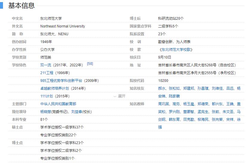 巍巍东师,根溯延安。1945年10月25日,毛泽东主席接见延安大学校院主要领导干部,指示学校向东北迁移,创办“新型的东北大学”。1946年2月东北大学在本溪建校,是中国共产党在东北地区创建的第一所综合性大学。1949年7月定址于长春。1950年4月更名为东北师范大学。1996年9月成为首批国家“211工程”重点建设大学。2004年6月经教育部批准设立研究生院。2007年,入选国家教师教育“985工程”优势学科创新平台建设高校。2017年9月,入选国家“双一流”建设高校。 两区办学,专业合理。学校现有自由校区和净月校区。全日制在校学生26997人,专任教师1671人,其中教授511人,副教授645人。学校设有22个学院(部),81个本科专业,23个博士学位授权一级学科,37个硕士学位授权一级学科,1个博士专业学位授权点和22个硕士专业学位授权点,以及22个博士后科研流动站。学科点覆盖了除军事学和医学以外的11个学科门类,形成了层次分明、类型多样的人才培养体系。 特色鲜明,成效斐然。学校以教育教学为立校之本。建校70余年来,形成了“为基础教育服务”的鲜明办学特色,被誉为“人民教师的摇篮”。上世纪50年代,我国著名教育家、校长成仿吾提出了为中小学教育服务的办学思想,学校首开中国高师函授教育之先河;80年代,学校主动服务农村基础教育,走出了一条享誉基础教育界的“长白山之路”;90年代,实施“优师工程”,为基础教育培养优秀教师;进入新世纪,启动实施“教育家培养工程”,探索“U-G-S教师教育新模式”。“优师工程”和“U-G-S教师教育新模式”先后荣获高等教育国家级教学成果一等奖。 科研强校,成果丰硕。学校以科学研究为强校之本。近年来,学校学科建设工作取得历史性突破,2017年9月公布的国家“世界一流大学和一流学科建设高校及建设学科”中,马克思主义理论、世界史、数学、化学、统计学、材料科学与工程6个学科入选世界一流学科建设行列,入选数量位列全国第19位、211院校之首。在教育部学位中心第四轮学科评估中,A类学科6个(其中马克思主义理论获评A+),B类学科15个。34个学科入选吉林省特色高水平学科。学校现有药物基因和蛋白筛选1个国家工程实验室和14个部级重点研究基地,世界文明史研究中心、农村教育研究所2个教育部人文社会科学重点研究基地。近年来,获得国家自然科学二等奖四项,其中材料科学研究领域的两项、统计学研究领域的一项、化学研究领域的一项成果获此殊荣;获得第七、八届高等学校科学研究优秀成果奖(人文社会科学)一等奖四项,其中历史学研究领域的三项、马克思主义理论研究领域的一项成果获此殊荣。 开放办学,助力发展。学校先后与美国、加拿大、英国、澳大利亚、韩国、日本、俄罗斯等30多个国家和地区的297所大学和科研机构建立了合作交流关系。2015年,与美国罗格斯新泽西州立大学合作设立了东北师范大学罗格斯纽瓦克学院。学校在韩国、西班牙、美国、加拿大、蒙古建立了孔子学院。国家汉办、国务院侨办、教育部及外交部分别在我校设立了“国际汉语教师培训基地”“华文教育基地”“教育援外基地”“中国-东盟教育培训中心”。中国赴日本国留学生预备学校设在我校。 群星璀璨,人才辈出。学校拥有一批国内外著名的专家学者。诗人、《中国人民解放军军歌》词作者公木(张松如),作家萧军、吴伯箫,文学史家杨公骥,语言学家孙常叙,历史学家李洵、丁则民、林志纯,教育学家陈元晖,音乐家马可、吕骥,病理学家白希清,数学家张德馨,核物理学家王琳,地理学家丁锡祉,鸟类学家傅桐生,中科院院士生物学家郝水,新中国学校体育创始人之一杨钟秀,大型团体操编导艺术家杨瑞雪、“红色理论家”郑德荣等著名学者,都曾经工作生活在这里。建校70余年来,学校传承红色基因,弘扬“强师报国,求实创造”的东师精神,共为国家培养输送各级各类毕业生30余万人,一大批优秀人才在教育领域脱颖而出,如攻克世界著名数学难题获得国家自然科学一等奖的包头九中教师陆家羲、感动中国的支边教师冯志远、全国模范教师郭力华、全国特级教师窦桂梅、全国十杰教师马宪华等。同时也培养了著名生态学家郑光美院士、物理学家孙昌璞院士、地理学家刘兴土院士、著名作家张笑天等为代表的各类人才。东师人“信念坚实、学识扎实、为人朴实、作风踏实”的“四实品格”得到社会广泛认可。 承典塑新,力行致远。新时代,新使命,新征程。东北师大将以学校第十五次党代会的胜利召开为契机,践行“尊重的教育、创造的教育”理念,坚持立德树人,深化内涵发展,提升教育质量,努力推进世界一流师范大学建设进程。 联系方式:吉林省长春市人民大街5268号(130024) Tel:(86-431)-85684088 Fax:(86-431)-85684009 注:2020年12月2日更新,由学校办公室提供。 |