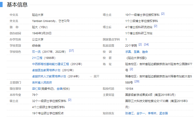 延边大学(Yanbian University)坐落在享有“教育之乡”美誉的吉林省延边朝鲜族自治州首府延吉市,是国家“双一流”建设高校、国家“211工程”重点建设大学、西部开发重点建设院校、吉林省人民政府和教育部共同重点支持建设大学、吉林省人民政府和国家民委共同支持建设大学。 学校始建于1949年,是中国共产党较早在少数民族地区建立的高校之一。现设有22个学院,76个本科专业;10个一级博士学位授权学科;32个一级硕士学位授权学科;19个专业硕士学位授权点,4个博士后科研流动站,1个博士后科研工作站。2017年,外国语言文学学科入选国家“双一流”建设学科。此外,学校还有1个国家级重点学科,15个吉林省特色高水平学科,15个延边大学重点学科。 学校现有教职员工2,225人,其中专任教师1,377人,专任教师中具有博士学位的773人,具有硕士学位的532人,具有副高级以上职称的739人,聘请了包括金宁一、陈芬儿院士等在内的100多名国内外著名专家为我校高端人才、名誉教授、兼职教授和客座教授,启动了“图们江学者支持计划”,加强高层次人才队伍建设,培育和引进一批具有较大发展潜力的学科领军人才和青年学术骨干。 学校面向全国31个省市、自治区招生,现有全日制在校学生27,100人(其中博士、硕士研究生5,581人,本科生19,477人,专科生2,042人),来自17个国家的留学生127人。现建设有东北寒区肉牛科技创新教育部工程研究中心、教育部人文社会科学重点研究基地——朝鲜•韩国研究中心等44个省部级以上科研机构,积极打造图们江论坛和长白山论坛两大国际学术论坛品牌。近三年来,学校共承担国家社会科学基金重大项目、国家社会科学基金重点项目、国家重点研发计划项目、国家科技部重点研发项目子课题、国家自然科学基金项目、国家社会科学基金项目、国家艺术基金、教育部项目、国家民委民族研究项目等各类国家级、部委级项目172项;省级、厅级项目344项,国际合作项目21项;发表学术论文5,168篇,其中国际三大科技文献检索论文(SCI、EI、ISTP ) 1,318篇,SSCI、A&HCI、CSSCI期刊论文268篇;获得省级以上各类科研奖项38项,获得专利123项。 学校坚持国际化战略,与29个国家和2个地区(香港,台湾)的277所院校和科研机构或国际学术组织建立了合作与交流关系。稳步发展留学生教育,获得教育部“中国政府奖学金来华留学生”接收资格。加强“延边大学中外语言文化交流合作中心”建设,先后与俄罗斯远东联邦大学、日本明治大学、韩国首尔大学、朝鲜金日成综合大学、瑞典斯德哥尔摩大学、美国匹兹堡大学等世界知名高校建立了校际关系,每年交流互访的专家学者近千名。 校园占地面积196万平方米,校舍建筑面积,92万平方米。图书馆各类纸质藏书达210多万册。美丽的校园,优良的办学条件,完备的基础设施,先进的教学楼、实验楼,整洁的学生宿舍、食堂,多功能的体育馆和活动中心,满足了教学科研和学生成长成才的需要。 建校73年来,学校始终坚持党的领导,坚定社会主义办学方向,在党的民族政策光辉照耀下,始终得到了党和国家的亲切关怀。周恩来总理、朱德委员长、董必武代主席等老一辈领导人以及胡耀邦、江泽民、贾庆林、张德江、俞正声等党和国家领导人都曾亲临学校视察工作并题词,为学校的发展指明了方向。 站在“两个一百年”奋斗目标的历史交汇点上,延边大学将坚持以习近平新时代中国特色社会主义思想为指导,深入学习贯彻党的十九大和十九届历次全会精神,不断强化党组织建设,落实“立德树人”根本任务,秉承“求真、至善、融合”的校训,发扬“艰苦创业、开拓进取,传承文化、突出特色,民族团结、共教共学,广泛交流、多边合作”的优良办学传统,紧紧抓住国家“双一流”建设和吉林省“双特色”建设重大机遇,以学校第十三次党代会确定的办学目标为指引,注重创新发展、质量发展、特色发展、融合发展,坚持人才培养核心地位,以一流学科建设为龙头,深入推进教育教学改革,强化内涵式高质量发展,争取早日实现建成国内一流、国际知名、特色鲜明的高水平大学的“延大梦”! (数据截至2022年3月1日) |