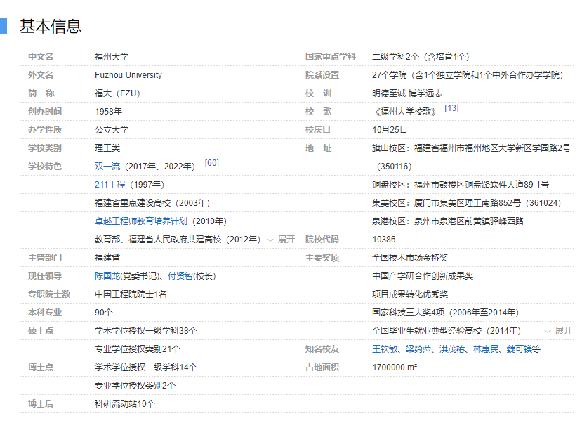 福州大学是国家“双一流”建设高校、国家“211工程”重点建设大学、福建省人民政府与国家教育部共建高校。学校创建于1958年,现已发展成为一所以工为主、理工结合,理、工、经、管、文、法、艺等多学科协调发展的重点大学。 建校以来,一代代福大人秉承“明德至诚,博学远志”校训,践行以张孤梅同志为代表的艰苦奋斗的创业精神、以卢嘉锡先生为代表的严谨求实的治学精神、以魏可镁院士为代表的勇于拼搏的奉献精神等“三种精神”,营造“守正创新、彰显特色、开放包容、追求卓越” 的新时代福州大学校园文化,积累了丰富的办学经验,形成了鲜明的办学特色,已为国家培养了全日制毕业生29万余人。 学校设有27个学院(含1个独立学院和1个中外合作办学学院),现有在校普通本科学生38427人,其中,至诚学院学生13185人;各类博、硕士研究生14358人。学校现设90个本科专业;38个一级学科硕士点、21个硕士专业学位授权点;14个一级学科博士点,2个专业学位博士点,10个博士后科研流动站。学校拥有1个国家重点学科、1个国家重点(培育)学科,化学学科再次入选世界一流学科建设名单。6个学科进入ESI学科全球排名前1%,其中化学学科进入ESI学科全球排名前1‰。学校综合实力在“2021软科世界大学学术排名”位居全球第396名,内地高校56名;在USNews2022世界大学排行榜位居全球第619名,内地高校第57名;在2021泰晤士高等教育世界大学排名位居全球第801-1000名,内地高校第57名;在2021QS亚洲大学排名位居第261-270名,内地高校并列66名。 学校现有教职工3229人,其中专任教师2186人。共有省级以上高层次人才634人次,其中国家级人才112人次(71人)、省级人才522人次(353人)。在高层次人才(团队)中,拥有院士15人(含特聘讲席教授14人),“长江学者奖励计划”人选10人(含青年项目3人),国家级高层次引进人才23人(含青年项目20人),国家“万人计划”入选者14人(含青年项目2人),国家杰出青年科学基金获得者8人,全国杰出专业技术人才1人,“百千万人才工程”国家级人选12人,国家有突出贡献中青年专家9人,国家优秀青年科学基金获得者4人,国家自然科学基金优秀青年科学基金项目(海外)获得者3人,科技部中青年科技创新领军人才及重点领域创新团队负责人7人,教育部创新团队负责人3人,文化名家暨“四个一批”人才3人。1支团队入选“全国专业技术人才先进集体”,2支团队入选“全国高校黄大年式教师团队”,2支团队入选教育部“长江学者和创新团队发展计划”,2支团队入选科技部“创新人才推进计划”重点领域创新团队,1个学院入选国家“高校国际化示范学院推进计划”,2个学院入选国家“高等学校学科创新引智计划”(“111计划”)。 学校拥有2个国家级人才培养基地、6个国家级实验教学示范中心、1个国家虚拟仿真实验教学中心、1个国家人才培养模式创新实验区、6个校企合作的国家工程实践教育中心、1个全国工程专业学位研究生联合培养示范基地、1个教育部首批“三全育人”综合改革试点院(系),1个教育部基础学科拔尖学生培养计划2.0基地,1个国家教学团队,7个国家特色专业,27个国家一流本科专业建设点,15个专业通过教育部工程教育专业认证,2个专业通过住建部行业评估,获评25门国家一流本科课程、3门国家精品课程、1门国家双语教学示范课程、3门国家级精品资源共享课、2门国家级精品视频公开课、4个国家虚拟仿真实验教学项目、7个教育部“新工科”研究与实践项目,4个教育部“新文科”研究与改革实践项目,获批教育部课程思政示范课程1门、国家级课程思政示范教学团队1个、全国思政课程教学名师工作室1个,入选高等学校思想政治理论课教学指导委员会委员1人、省级课程思政研究与实践中心1个、省级课程思政示范课程2门。学校是全国专业学位研究生教育综合改革试点单位和全国工程硕士研究生教育创新高校、教育部“卓越工程师教育培养计划”改革试点高校和教育部“国家大学生创新创业训练计划”实施高校。“十三五”以来,学校获国家级教学成果奖4项,省级教学成果奖26项;学生参加各类学科竞赛获246项国际奖,2112项国家级奖。学校入选“全国首批深化创新创业教育改革示范高校”“国家级众创空间”“国家大学生创业示范园”。在前七届中国“互联网+”大学生创新创业全国总决赛中获9金18银25铜。学校毕业生就业率连续多年保持在95%以上,曾荣获“全国高校毕业生就业工作50强”。 学校现有1个国家级大学科技园,12个国家级、131个省部级科技创新平台,其中:1个国家重点实验室,8个国家级工程研究中心,3个国家国际科技合作基地,3个教育部重点实验室,1个教育部工程研究中心,2个省部共建协同创新中心,1个自然资源部创新服务平台,2个省创新实验室。学校是福建省唯一同时拥有“国家大学科技园”“国家技术转移示范机构”“高等学校科技成果转化和技术转移基地”“国家知识产权试点高校” “国家级众创空间”“全国大学生创业示范园”“全国深化创新创业教育改革示范高校”“全国创业孵化示范基地”的高校。“十三五”以来,学校获各类科技项目4757项,科研经费超过18.2亿元。签订横向合作合同3294项,校地企合作到校经费15.4亿元。获省部级以上奖项243项,其中,国家科技奖4项。获国家专利授权5320件,科技论文被三大检索收录12618