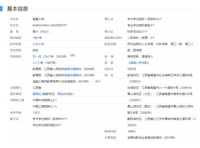 南昌大学是国家“双一流”计划世界一流学科建设高校、教育部与江西省部省合建高校、国家“211工程”重点建设高校、江西省高水平大学整体建设高校。 学校地处“英雄城”南昌市,拥有前湖、青山湖、东湖、鄱阳湖4个校区,其中前湖主校区占地面积4321亩,校舍建筑面积150万平方米。 学校办学始于1921年创办的江西公立医学专门学校和1940年创建的国立中正大学。1993年,江西大学与江西工业大学合并组建南昌大学,开创了全国高等教育体制改革的先河。2005年,南昌大学与江西医学院合并组建新南昌大学,揭开了学校改革发展的崭新一页。党和国家领导人、教育部和江西省委、省政府高度重视学校的建设与发展。2008年10月,习近平同志视察学校时深情寄语“南昌大学前景无限”。2016年2月,习近平总书记再次亲临学校视察,就高校科研创新和人才培养发表重要讲话,并勉励学校走创新发展之路,希望当代大学生珍惜韶华,用青春铺路,让理想延伸。 学校现设有人文学部、社科学部、理工一部、理工二部和医学部,拥有12个学科门类的132个本科专业,3个国家重点(培育)学科, 22个博士学位授权一级学科,3个博士专业学位授权类别,11个博士后科研流动站;51个硕士学位授权一级学科,30个硕士专业学位授权类别。学校设有5所直属附属医院,共有9个国家临床重点专科。学校的化学、临床医学、农业科学(食品科学与工程为主)、工程学、材料科学、药理学与毒理学、生物学与生物化学、分子生物学和遗传学等8个学科进入ESI世界排名前1%。其中农业科学(食品科学与工程为主)进入ESI世界排名前1.02‰,临床医学进入ESI世界排名前2.2‰,化学进入ESI世界排名前2.68‰。在全国第四轮学科评估中,食品科学与工程学科评估等级为A,位列全国第3名。学校在2021第三方权威机构学术排名中进入全球前400位。 学校本部现有在编教职工4400人(其中专任教师2688人,正副教授1530人),其中中国科学院院士2人、中国工程院院士1人,“双聘”院士4人,国际食品科学院院士1人,国家级人才82人。全国优秀博士学位论文指导教师1人,国务院学位委员会学科评议组成员1人,国家级教学团队1个。学校始终坚持以人才培养为中心,落实立德树人根本使命,近年来涌现了“全国教育系统先进集体”国家硅基LED工程技术研究中心、“全国工人先锋号”工程力学实验中心等先进集体和全国优秀共产党员江风益、国际护理界最高荣誉奖“南丁格尔奖章”获得者邹德凤等为代表的一批爱岗敬业、立德树人的先进典型;“江西省模范教师”王雨、“博导妈妈”石秋杰用生命诠释了南昌大学教师“爱党爱国、爱岗敬业、爱校如家、爱生如子”的“四爱”精神。 学校本部现有全日制本科学生34232人,各类研究生16538人,国(境)外学生1679人。学校积极推进人才培养模式改革,形成了以“三制、三化、三融合”为特征的拔尖人才培养模式、以卓越人才培养为代表的应用型人才培养模式、以双学位和主辅修为形式的复合型人才培养模式。入选国家级课程思政示范课程4门、国家级课程思政教学名师和团队4个。入选“高校思想政治工作精品项目”1项。入选全国高校“百个研究生样板党支部”、全国高校“百名研究生党员标兵”。获评“全国党建工作标杆院系”1个,“全国党建工作样板支部”2个,全国高校“双带头人”教师党支部书记工作室1个。建校以来,学校共培养了50多万优秀人才,为国家和地方经济社会发展作出了重要贡献。 学校围绕立德树人根本任务,牢固树立人才培养的中心地位、教育教学的基础地位和本科教学的优先地位。对接教育部“双万”计划,获批39个国家级一流本科专业建设点、39个省级一流本科专业建设点。30门课程入选国家“一流课程”,总数位居部省合建高校首位,全国第37位。连续两届共获国家级教学成果二等奖5项。学校是全国首批深化创新创业教育改革示范高校,是教育部中国教育和科研计算机网(CERNET)江西主节点单位,是江西唯一参与中国下一代互联网示范工程CNGI建设的高校。 学校现有1个国家重点实验室,1个国家工程技术研究中心,2个国家地方联合工程研究中心,1个国家示范型国际科技合作基地,1个中国-加拿大食品科学与技术联合实验室(南昌),2个教育部省部共建协同创新中心,1个教育部人文社会科学重点研究基地,1个教育部高校科技成果转化和技术转移基地,1个高校国家知识产权信息服务中心,1个全国红色旅游创新发展研究基地,1个全国高校思想政治工作队伍培训研修中心,1个国家基因检测技术应用示范中心,2个教育部重点实验室,3个教育部工程研究中心,1个国家级大学科技园,2个国家级虚拟仿真实验教学中心,5个国家级实验教学示范中心,2个国家级大学生校外实践教育基地,4个国家级工程实践教育中心,9个江西省协同创新中心,3个“5511”重大科技创新培育平台,73个省部级科技平台(不含附属医院),19个省哲学社会科学重点研究基地。2021年,学校获批国家自然科学基金立项326项,其中国家杰出青年科学基金1项、优秀科学青年基金项目1项、重点项目2项、重点国际(地区)合作与交流项目1项;获批国家社会科学基金项目25项。 学校协同创新能力不断增强,取得了一批原创性、标志性、有特色的科研成果。江风益教授团队“硅衬底高光效GaN基蓝色发光二极管”项目摘得2015年度唯一国