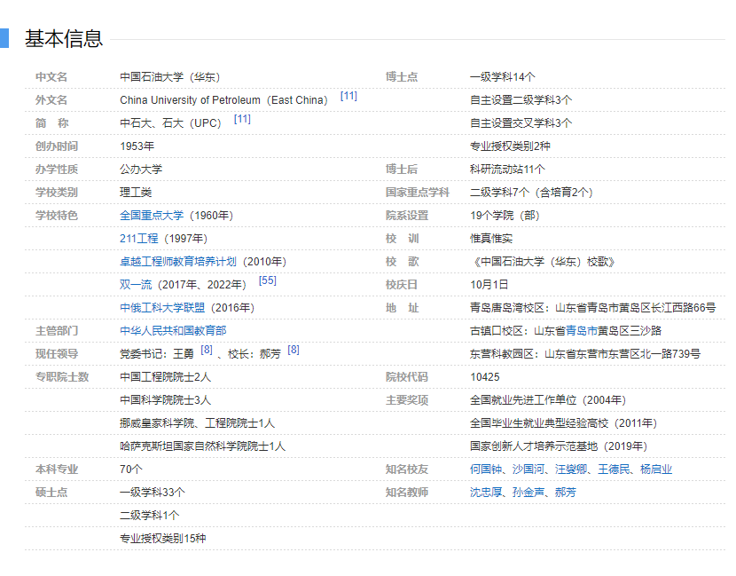 中国石油大学(华东)是教育部直属全国重点大学,是国家“211工程”重点建设和开展“985工程优势学科创新平台”建设并建有研究生院的高校之一。学校还是教育部和五大能源企业集团公司、教育部和山东省人民政府共建的高校,是石油石化高层次人才培养的重要基地,被誉为“石油科技、管理人才的摇篮”,现已成为一所以工为主、石油石化特色鲜明、多学科协调发展的大学。2017年、2022年均进入国家“双一流”建设高校行列。 追溯学校历史,1953年新中国成立之初,国民经济建设急需石油资源,石油工业发展急需专业人才。在这种形势下,以清华大学石油工程系为基础,汇聚北京大学、天津大学、大连工学院等著名高校的相关师资力量和办学条件,组建成立了新中国第一所石油高等学府——北京石油学院,隶属燃料工业部,是当时北京著名的八大学院之一。1960年10月,学校被确定为全国重点高校。1969年,学校迁至胜利油田所在地——山东东营,更名为华东石油学院。1981年6月在北京石油学院原校址内成立研究生部。1988年,学校更名为石油大学,逐步形成山东、北京两地办学格局。1997年,石油大学正式进入国家“211工程”首批重点建设高校行列。2000年,石油大学由中国石油天然气集团公司划归教育部。2000年6月,经教育部批准,学校成立研究生院。2003年10月,教育部与国家四大石油公司签署共建石油大学协议。2004年8月,教育部批准石油大学(华东)立项建设青岛校区。2005年1月,学校更名为中国石油大学。2005年8月,教育部与山东省人民政府签署共建中国石油大学(华东)协议。2006年10月,学校以“优秀”成绩通过教育部本科教学工作水平评估。2010年,学校成为国家首批实施“卓越工程师教育培养计划”的61所试点高校之一和承担国家“专业学位研究生教育综合改革试点工作”的32家部属高校之一。2014年4月,教育部与中国石油天然气集团公司、中国石油化工集团公司、中国海洋石油总公司、神华集团有限责任公司、陕西延长石油(集团)有限责任公司等五大能源企业集团公司签署共建中国石油大学协议。2018年12月,教育部、山东省人民政府重点共建中国石油大学(华东)。2021年,经教育部批准,东营校区调整为东营科教园区,办学主校区调整到青岛。 学校总占地面积5000余亩,建筑面积130余万平方米,发展形成了“两校区一园区”(青岛唐岛湾校区、古镇口校区以及东营科教园区)的办学格局。青岛两校区地处迷人的帆船之都、海滨之城,享有极高美誉的青岛,东营科教园区地处黄河三角洲的中心城市、生态之城、石油之城——山东东营,“两校区一园区”均位于“蓝黄”两大国家战略重点区域,同时青岛两校区还处于2014年新设立的国家级新区——青岛西海岸新区。学校建有研究生院,有地球科学与技术学院,石油工程学院,化学化工学院,机电工程学院,储运与建筑工程学院,材料科学与工程学院,石大山能新能源学院,海洋与空间信息学院,控制科学与工程学院,青岛软件学院、计算机科学与技术学院,理学院,经济管理学院,外国语学院,文法学院,马克思主义学院,体育教学部等16个教学学院(部),以及荟萃学院、国际教育学院、远程教育学院和继续教育学院。 学科专业覆盖石油石化工业的各个领域,石油主干学科总体水平处于国内领先地位。有14个博士学位授权一级学科,3个博士学位授权自主设置二级学科,9个博士授权自主设置交叉学科,2种博士专业学位授权类别,33个硕士学位授权一级学科,1个硕士学位授权二级学科,15种硕士专业学位授权类别,61个本科招生专业,11个博士后流动站。拥有矿产普查与勘探、油气井工程、油气田开发工程、化学工艺、油气储运工程等5个国家重点学科,以及地球探测与信息技术、工业催化等2个国家重点(培育)学科。工程学、化学、材料科学、地球科学、计算机科学、环境与生态学、社会科学总论等7个学科领域进入ESI全球学科排名前1%,其中工程学进入ESI全球学科排名前1‰。石油与天然气工程、地质资源与地质工程2个一级学科入选国家“双一流”建设计划。石油与天然气工程、地质资源与地质工程、安全科学与工程、地质学、化学工程与技术、地球物理学等6个一级学科进入教育部第四轮学科评估全国前十名。 学校教育体系完备,各类教育层次结构合理,现有全日制在校本科生近18900人、研究生9400余人,留学生970余人。建校以来,学校始终坚持以人才培养为根本任务,着力打造人才培养质量品牌,赢得了广泛的社会声誉。从广大校友中涌现出大批杰出人才,走出了30位两院院士以及一大批石油石化行业领军人物和工程技术骨干。自国家实行毕业生双向选择就业政策以来,毕业生就业率连续27年保持在90%以上,2004年被国务院授予“全国就业先进工作单位”荣誉称号,2011年入选50所全国毕业生就业典型经验高校,2019年入选“国家创新人才培养示范基地”。 学校拥有一支师德高尚、业务精湛、结构合理、充满活力的高素质教师队伍。现有教师1700余人,其中教授、副教授1100余人,博士生导师329人。有两院院士8人(含双聘),国家“万人计划”科技创新领军人才6人,长江学者特聘教授3人,国家杰出青年科学基金获得者6人,“973计划”项目首席科学家1人,国家“百千万人才工程”入选者13人;中青年科技创新领军人才6人,长江学者青年学者5人,国家优秀青