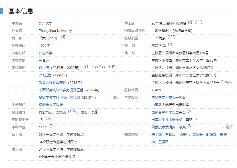 郑州大学(简称郑大,英文简称:ZZU)由河南省人民政府兴办,法定住所地为河南省郑州市科学大道100号。学校总占地面积6100余亩,主校区位于郑州市科学大道100号,主校区南校园位于郑州市大学北路75号,主校区北校园位于郑州市文化路97号,主校区东校园位于郑州市大学北路40号,主校区西校园位于郑州市科学大道157号;洛阳校区位于洛阳市周山大道6号。学校面向全国招生,现有全日制普通本科生4.7万余人、研究生2.4万余人,以及来自103个国家的留学生2700余人。 郑州大学是国家“211工程”重点建设高校、世界一流大学建设高校和“部省合建”高校。校党委是全国先进基层党组织,学校入选教育部第三批“全国党建工作示范高校”。站在新的历史起点上,学校确立了综合性研究型大学办学定位,努力建设高水平研究型大学和区域性国家战略科技力量,提出了一流大学建设“三步走”发展战略,力争到本世纪中叶建成世界一流大学。 郑州大学医科教育源于1928年的河南中山大学,1952年河南医学院独立建院,开启了河南医学高等教育的先河;原郑州大学创建于1956年,是新中国创办的第一所综合性大学,1996年被列入国家“211工程”重点建设高校;郑州工业大学成立于1963年,是原化工部直属的重点院校。2000年7月,原郑州大学、郑州工业大学和河南医科大学三校合并组建新郑州大学。教育家、历史学家、哲学家嵇文甫教授,物理学家霍秉权教授,耐火材料专家钟香崇院士,土木工程专家孙国梁教授,耳鼻咽喉科专家董民声教授,食管细胞学创始人沈琼教授,人体寄生虫学专家苏寿汦教授,南阳作家群代表人物二月河教授等一大批知名专家学者,都曾在此弘文励教。 悠久历史铸就郑大特色文化 植根中原文化的博大精深和沉稳厚重,形成郑大人包容宽厚、奋发进取的优良品质;汇聚多元文化的交融共生,学生来自全国34个省级行政区、世界103个国家,形成多地域、多民族、多文化交流融合的文化氛围;文、理、工、医、农等12个学科门类均衡发展,形成多学科交叉、相融互补的育人氛围;传承和弘扬源远流长的特色文化,多个校园的特色文化长期积淀与升华,孕育“求是 担当”的校训,形成“笃信仁厚、慎思勤勉”的校风,学校荣获全国文明校园。在强化自身文化建设的同时,学校注重发挥文化引领的社会职责,努力为华夏文明传承创新做出新的贡献。 融合发展完成综合性大学布局 学校设有哲学、经济学、法学、教育学、文学、历史学、理学、工学、农学、医学、管理学、艺术学12大学科门类,各学科门类均衡发展;有化学、材料科学与工程、临床医学3个世界一流建设学科;有凝聚态物理、材料加工工程、中国古代史、有机化学、化学工艺、病理学与病理生理学6个国家重点(培育)学科;有化学、材料科学、临床医学、工程学、药理学与毒理学、生物学与生物化学、分子生物学与遗传学、神经科学与行为学、免疫学、环境与生态学、物理学、社会科学总论、计算机科学等13个ESI全球前1%学科,其中化学ESI排名全球前1‰;学术机构排名列全球第433位、国内高校第30位。学校有31个一级学科博士学位授权点、4个博士专业学位授权点,59个一级学科硕士学位授权点、34个硕士专业学位授权点,28个博士后科研流动站。现有专任教师(含专职科研)4400余人,其中两院院士、学部委员21人;“国家杰出青年科学基金”获得者10人、“长江学者奖励计划”入选者22人、国家“百千万人才工程”人选27人,教授784人,专任教师中具有博士学位教师占比71.8%,形成了一支以院士和学术大师为引领,以“杰青”“长江”等为学术带头人的高水平师资队伍。中国工程院崔俊芝院士担任河南省大数据研究院院长,中国科学院高俊院士担任地球科学与技术学院院长,中国工程院何季麟院士担任材料科学与工程学院、河南省资源与材料工业技术研究院院长,中国工程院王复明院士担任地下工程研究院院长,中国工程院陈芬儿院士担任药学院、药物研究院院长,英国医学科学院院士、中国工程院外籍院士尼克•莱蒙担任郑州大学医学科学院国际院长,中国社会科学院学部委员刘庆柱担任历史学院、中原历史与文化研究院(考古与文化遗产学院)院长,中国社会科学院学部委员金碚担任商学院院长,南振中先生、张海先生等执教我校。 立德树人形成完备人才培养体系 学校校本部现有55个院系,118个本科专业。学校现有国家级教学团队4个,国家级教学名师6人,国家级专业综合改革试点专业6个,国家级特色专业14个,国家级一流本科专业建设点43个,通过国家级认证专业19个,国家级实验教学示范中心5个,国家级虚拟仿真实验教学中心1个,国家级工程实践教育中心7个,国家级精品课程14门,国家级精品视频公开课4门,国家级精品资源共享课14门,国家级双语教学示范课程2门,国家级一流课程23门,国家级人才培养模式创新实验区2个,国家理科基础科学研究和教学人才培养基地1个,国家大学生文化素质教育基地1个,国家级大学生校外实践教育基地2个,获国家级教学成果奖11项,获批教育部基础学科拔尖学生培养计划2.0基地1个,获批国家课程思政示范课程、教学名师和教学团队1个。学校先后被列入国家级卓越工程师、卓越法律人才、卓越医生教育培养高校。学校被评选为“2012—2014年度国家级大学生创新创业训练计划实施工作先进单位”,是国