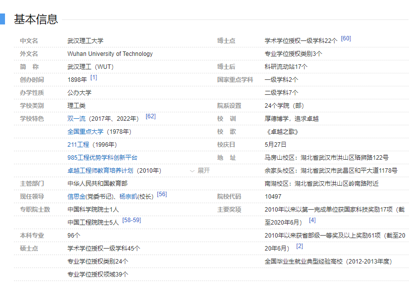 武汉理工大学是教育部直属全国重点大学,是首批列入国家“211工程”和“双一流”建设高校,是教育部和交通运输部等部委共建高校。学校办学历史起源于1898年建立的湖北工艺学堂,办学123年特别是近70年来,学校共培养了60余万名高级专门人才,是教育部直属高校中为建材建工、交通、汽车三大行业培养人才规模最大的学校,已成为我国“三大行业”高层次人才培养和科技创新的重要基地。目前学校在校普通本科生36000余人,博士、硕士生20000余人,留学生900余人。 学校经过长期的育人实践,形成了特色鲜明的办学思想体系:构筑了“建设让人民满意、让世人仰慕的优秀大学”的大学理想,铸就了“厚德博学、追求卓越”的大学精神,确立了“育人为本、学术至上”的办学理念,树立了“实施卓越教育、培养卓越人才、创造卓越人生”的卓越教育观。学校致力于为社会培养一代又一代以智慧引领人生、具有卓越追求和卓越能力的卓越人才。 学校现有马房山校区、余家头校区和南湖校区,占地4000余亩,校舍总建筑面积195.3万平方米,4座现代化图书馆藏书361.51万册。设有24个学院(部),建有6个独立建制的科研院所。现有教职工5441人,其中中国科学院院士1人,中国工程院院士5人,比利时皇家科学院院士1人,澳大利亚工程院院士1人,欧洲科学院院士3人,俄罗斯工程院外籍院士4人,世界陶瓷科学院院士1人;获中组部、科技部、国家自然科学基金委员会、教育部和湖北省政府人才计划支持的高端人才144人。 学校已形成以工学为主,理、工、经、管、艺术、文、法等多学科相互渗透、协调发展的学科专业体系。现有一级学科博士学位授权点22个,一级学科硕士学位授权点45个,博士后科研流动站17个;有博士专业学位授权类别3个,硕士专业学位授权类别24个。在国家第四轮学科评估中,材料科学与工程获A+,机械工程、交通运输工程、设计学、马克思主义理论等学科获B+。现有本科专业96个,其中国家一流本科专业建设点37个、国家特色专业15个、卓越工程师教育培养计划试点专业28个、国家综合改革试点专业4个、国家战略性新兴产业专业2个。现有国家级一流本科课程40门、国家级精品资源共享课17门、国家级精品视频公开课8门。拥有国家级教学团队5个、教育部人才培养模式实验区4个、国家级实验教学示范中心5个、国家级工程实践教育中心13个、国际化示范学院1个、全国高校实践育人创新创业基地与全国创业孵化示范基地各1个。 近10年,学校培养了一批全国优秀大学生代表,1人获“全国最美大学生”,2人获“中国青年五四奖章”,4人获“中国大学生年度人物”称号,4人获“中国大学生自强之星标兵”称号,15人获“中国大学生自强之星”称号,6人获“中国青年志愿者优秀个人奖”,5人获“中国青少年科技创新奖”。在中国高等教育学会发布的2020年全国普通高校大学生竞赛排行榜中,学校在2016-2020年全国普通高校大学生竞赛排行榜五轮总排行(本科)中位列第12,在全国普通高校大学生竞赛排行榜(本科)位列第14。学校毕业生就业率近十年持续保持在95%以上,其中到世界500强企业和战略性新兴产业领域就业人数占总就业人数比例超过50%。 学校建有材料复合新技术国家重点实验室、硅酸盐建筑材料国家重点实验室、光纤传感技术国家工程实验室、国家水运安全工程技术研究中心等40个国家级和省部级科研基地,建有内河智能航运交通运输部协同创新中心、汽车零部件技术湖北省协同创新中心、安全预警与应急联动技术湖北省协同创新中心等3个省部级协同创新中心。学校获批交通强国建设试点单位,入选首批国家知识产权示范高校、第二批高等学校科技成果转化和技术转移基地,与地方政府和行业企业共建产教融合示范区、科教创新园、工业技术研究院等科教合作与成果转化机构324个。2010年以来,学校以第一完成单位获国家自然科学奖2项、技术发明奖和科技进步奖16项、省部级一等奖及以上奖励72项;作为参加单位获国家科技进步特等奖1项、一等奖2项;获授权发明专利6382项;在世界顶尖学术期刊Science发表论文2篇、Nature发表论文5篇。 学校与美国、英国、日本、法国、加拿大、澳大利亚、俄罗斯、荷兰等国家的190多所大学和科研机构建立了人才培养、学术交流及科研合作等关系,聘请了200余名国外著名学者担任学校战略科学家、客座教授和名誉教授等。此外,与国外著名高校及研究机构建立了16个高水平国际研究合作平台。学校先后建立了材料复合新技术国际联合实验室、环境友好建筑材料国际科技合作基地、智能航运与海事安全国际科技合作基地等7个国家级和省部级国际科技合作基地。2016年,学校与英国威尔士三一圣大卫大学合作建立的首个海外校区正式运行。2018年,学校与法国艾克斯-马赛大学合作设立武汉理工大学艾克斯马赛学院。 百廿余年,风雨兼程,武汉理工大学将以习近平新时代中国特色社会主义思想为指导,以立德树人为根本,围绕建设“让人民满意、让世人仰慕的优秀大学”的崇高大学理想,坚持以特色创优势的发展道路,努力建设成为特色鲜明的世界一流大学。 (数据截至2021年12月) |