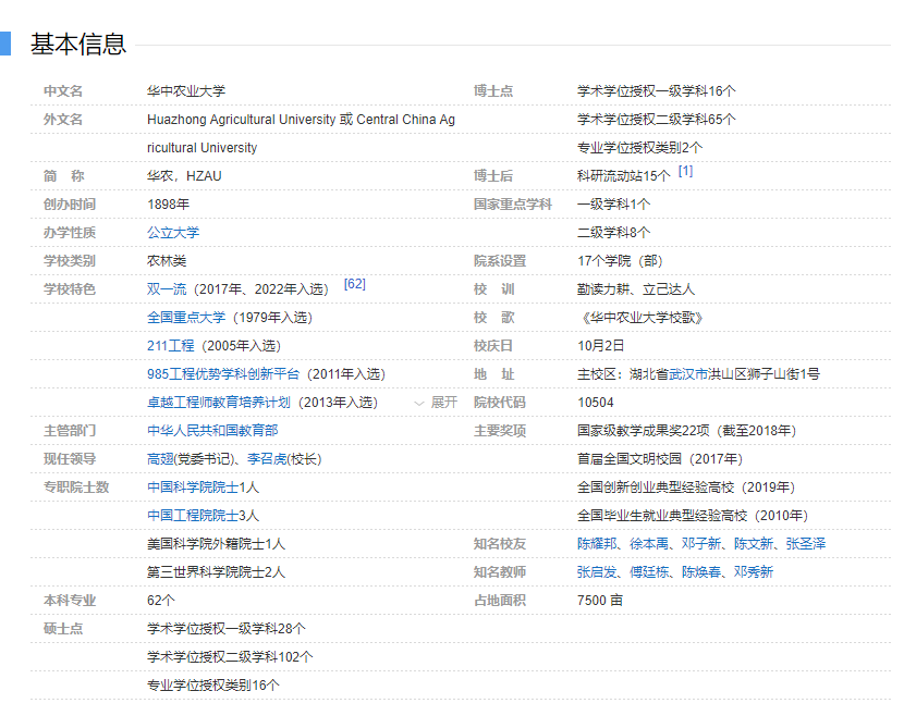 中国高等农业教育起点之一 学校前身是清朝光绪年间由湖广总督张之洞于1898年创办的湖北农务学堂。几经演变,1952年,武汉大学农学院和湖北农学院的全部系科以及中山大学等6所综合性大学农学院的部分系科组建成立华中农学院。1979年,经国务院批准列为全国重点大学,直属农业部。1985年,更名为华中农业大学。2000年,由农业部划转教育部直属领导。2005年,进入国家“211工程”建设行列。2017年,列入国家“双一流”建设行列。 党和国家领导亲切关怀 董必武、李先念等先后为学校题词和题写校名。1998年,时任中共中央总书记、国家主席江泽民为学校百年校庆亲笔题词。2011年,时任中共中央总书记、国家主席胡锦涛听取我校关于生物产业的汇报。2013年,中共中央总书记、国家主席习近平给我校“本禹志愿服务队”回信,并提出“与祖国同行、为人民奉献”的殷殷嘱托。 校园环境得天独厚 校园位于湖北省武汉市主城区,坐拥狮子山,三面环湖,拥有5平方公里山水校园,9公里浪漫湖岸线,10公里“林中路”,6.6公里湖光绿道,环境幽雅,风景秀丽,景面文心、情境交融的校园风貌引人入胜。 学科优势特色明显 生物学、园艺学、畜牧学、兽医学、农林经济管理5个学科入选国家“双一流”建设学科。在全国第四轮一级学科评估中,7个学科进入A类学科,其中,园艺学、畜牧学、兽医学等3个学科为A+,生物学为A,食品科学与工程、作物学、农林经济管理等3个学科为A-。据美国信息科技所《基本科学指标》数据库(ESI)统计数据显示,我校11个学科领域进入ESI前1%,2个学科领域进入前1‰,分布于农学、生命科学、理学、工学、医学等5个门类。其中,进入前1%的学科(植物学与动物学,农业科学,生物学与生物化学、环境科学/生态学、微生物学、分子生物与遗传学)实现了农学、生命科学2个门类的全覆盖;进入前1‰的学科(植物学与动物学,农业科学)实现了农学门类的全覆盖。 教育体系完整。现有学院(部)17个,本科专业63个,硕士学位授权一级学科28个,硕士专业学位授权类别16个,博士学位授权一级学科16个,博士专业学位授权类别2个,博士后科研流动站15个。全日制在校学生31219人,其中本科生18906人,硕士生8987人,博士生2891人,留学生435人。 硕彦俊秀荟萃。现有教职工3013人,其中教师1688人,教授527人,博士后325人。有中国科学院院士1人,中国工程院院士3人,美国科学院外籍院士1人,第三世界科学院院士2人,国际欧亚科学院院士1人,国家杰出青年基金获得者26人,国家优秀青年基金获得者24人,973计划首席科学家6人,现代农业产业技术体系首席科学家1人、岗位科学家59人。国家自然科学基金创新研究群体4个,省部级优秀创新团队76个。国家教学名师5人,国家级教学团队7个。 教育教学改革卓有成效 累计获国家级教学成果奖24项,其中特等奖1项、一等奖4项、二等奖19项。获批国家教育体制改革项目1项、国家首批基础学科拔尖学生培养计划2.0基地1个、国家级新农科研究与改革实践项目6项、国家级新工科研究与实践项目5项、国家级新文科研究与改革实践项目4项、国家级一流专业建设点23个、国家专业综合改革试点专业2个、国家“卓越工程师教育培训计划”专业2个、国家“卓越农林人才教育培养计划”专业8个、首批国家级一流本科课程42门。 建有国家级实验教学示范中心4个、教育部农业部农科教合作人才培养基地6个、国家级大学生校外实践基地11个。 科技实力雄厚 有国家重点实验室2个,国家地方联合工程实验室1个,专业实验室5个,国家级研发中心7个,国际科技合作基地8个,部省级重点(工程)实验室29个,部省级研发中心35个,高等学校学科创新引智基地(“111”计划)6个,引进国外智力成果示范推广基地1个,校企共建实验室(研发中心)35个,省级高校人文社科重点研究基地4个。“十三五”期间获批科研项目6318项,经费43.73亿元。在杂交油菜、绿色水稻、优质种猪、动物疫苗、优质柑橘、试管种薯和玉米、淡水鱼等研究领域,取得一批享誉国内外的标志性成果。 精神文明建设成绩优异 1996年以来,学校连续十次被评为湖北省最佳文明单位,2005年获全国精神文明建设先进单位,2008年以来连续获评全国文明单位。2017年获评首届全国文明校园,2020年再次荣膺这一荣誉称号。 发展愿景:到本世纪中叶,建校150周年之际,把学校建设成为特色鲜明世界一流大学。 数据截止: 2022年3月 |