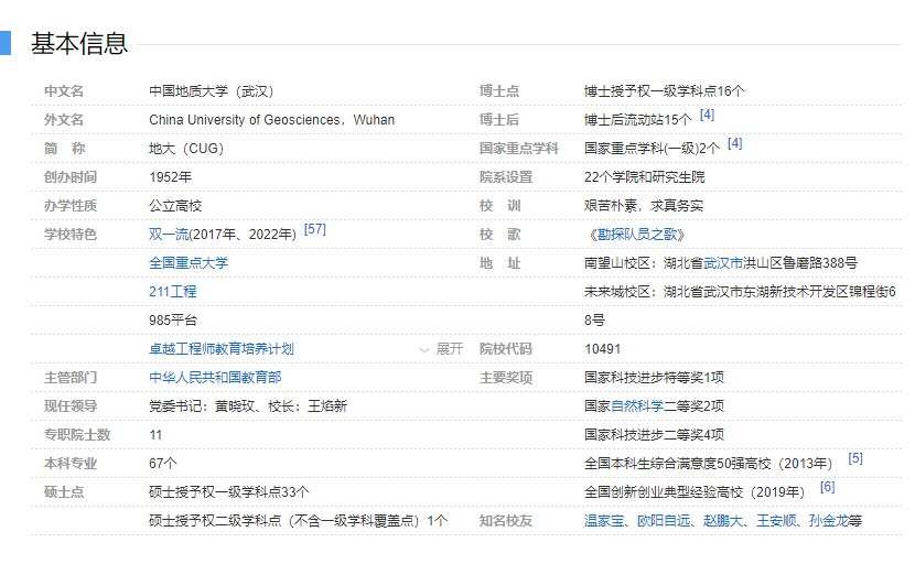 中国地质大学是教育部直属全国重点大学, 是国家批准设立研究生院的大学,是国家“211工程”、国家“双一流”建设高校。中国地质大学位于武汉东湖之畔,南望山麓,学校以地球科学为主要特色,学科涵盖理学、工学、文学、管理学、经济学、法学、教育学、艺术学等门类,地质学、地质资源与地质工程2个一级学科入选“双一流”建设学科。 校园概貌 中国地质大学位于武汉东湖国家自主创新示范区腹地,现有南望山校区、未来城校区等两个校区,校园占地总面积1474353平方米,校舍总面积1385752.04平方米。学校拥有国家4A级旅游景区——逸夫博物馆,校园环境优美,教育、科研、学术氛围浓厚,拥有现代化的教学楼群、图书馆、学生公寓、体育场馆等相关配套设施,为莘莘学子提供了良好的学习、生活和成长的环境。 办学思想 坚持弘扬“艰苦朴素,求真务实”校训精神,坚持弘扬“严在地大”的校风学风,坚持弘扬“谋求人与自然和谐发展”的价值观,着力培养能够担当民族复兴大任、“品德高尚、基础厚实、专业精深、知行合一”的高素质人才,着力为解决区域、行业乃至人类面临的资源环境问题提供高水平的人才和科技支撑。 秉承“强化特色、争创一流、依法治校、开放包容”的治校理念,营造“独立思考、严谨治学、勇于探索、追求卓越”的文化氛围,努力构建优越而独特的教学和科研环境。以提高办学质量为中心,推进“跨学科专业交叉融合、教学与科研实践融合、创新创业教育与专业教育融合的“三融合”人才培养模式改革,提升科技创新和社会服务能力。坚持实施人才强校、科技兴校和国际化战略,大力推进以学术卓越计划为核心的综合改革,在建成地球科学一流、多学科协调发展的高水平大学的基础上,努力建设成为地球科学领域国际知名研究型大学,致力于实现地球科学领域世界一流大学的办学目标。 办学条件 学校现有教职员工3369人,其中教师1956人。中国科学院院士13人,中国工程院院士1人,博士生导师631人,教授452人,副教授814人。 国家杰出青年科学基金获得者16人,国家优秀青年科学基金获得者19人,教育部“新世纪优秀人才”入选者29人。学校拥有国家自然科学基金委创新研究群体3个,教育部创新团队3个,国家级教学团队6个,国家级教学名师1人,湖北省教学名师9人。 学校现有各类科研机构、实验室、研究院(所、中心)86个,其中国家重点实验室2个,国家工程技术研究中心1个,科技部地质工程国际科技合作基地1个,科技部创新人才培养示范基地1个。学校拥有完善的实验实践教学体系,有国家级实验教学示范中心3个,国家级虚拟仿真实验教学中心1个。自建校起,学校相继在周口店、北戴河、秭归等地建立了教学实习基地。其中周口店野外实习基地被誉为“地质工程师的摇篮”,为“全国地质实验(实践)教学示范中心”、“国家基础学科人才培养能力(野外实践)基地”。学校图书馆馆舍面积2.7万余平方米,拥有丰富的文献资源,形成了以科技文献为主体,以地学文献为特色的馆藏体系,构建了以信息技术为基础的服务平台,为师生提供有效的文献资源保障。 学科布局 学校围绕学科前沿和经济社会发展的需求,构建以地球科学为主导,多学科相互支撑、协调发展的学科生态系统。现有2个国家一级重点学科,16个湖北省重点学科,“地质学”、“地质资源与地质工程” 两个一级学科在全国历次学科评估中均排名第一;有23个学院、69个本科专业;有16个一级学科博士点,34个一级学科硕士点,15个博士后科研流动站;有工程硕士、MBA、MPA等10个专业学位授予权,其中工程硕士专业包涵14个工程领域。 人才培养 学校拥有“学士-硕士-博士”完整的人才培养体系。其中全日制在校学生31040人,包括本科生18214人,硕士研究生10758人,博士研究生2068人,国际学生787人;成教及网络教育注册学生5万余人。拥有国家地质学理科人才培养基地和国土资源部地质工科人才培养基地。建校60余年来,为国家培养了近30万名高级人才。 学校全面落实立德树人根本任务,以培养“品德高尚、基础厚实、专业精深、知行合一”的优秀人才为目标,努力构建跨学科专业交叉融合、教学与科研实践融合、创新创业教育与专业教育融合的“三融合”人才培养模式。我校学生在具有广泛影响力的全国挑战杯大赛、数学建模大赛、英语竞赛、电子设计大赛等高水平赛事中屡获佳绩。 学校把弘扬优良体育传统与健全人格培养相结合,逐步形成了特色鲜明的体育教育教学体系。我校学生在国际国内重大体育比赛中,累计获得金牌250余枚,银铜牌500余枚。2012年5月,学校登山队成功登顶珠峰,成为我国第一支登上世界最高峰的大学登山队。 科学研究 学校在地质学、矿产资源能源、地质工程、地球物理、水文地质与环境地质、地理信息系统与测绘、材料科学与化学、经济与管理等研究领域具有特色和优势,取得一批重要成果。2010年以来,获国家科技进步特等奖2项(参与)、国家自然科学二等奖1项、国家科技进步二等奖3项,省部级科技奖励38项,获“中国科学十大进展”1项、“十大地质科技进展”2项、“十大地质找矿成果”2项。科睿唯安(原汤森路透)“高被引科学家” 5人,爱思唯尔“高被引学者” 9人,入选ESI高被引论文作者61人。学校主办的《地球科学》(中文版)被国际著名检索系统EI Co