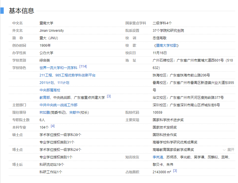 暨南大学是中国第一所由政府创办的华侨学府。“暨南”二字出自《尚书·禹贡》:“东渐于海,西被于流沙,朔南暨,声教讫于四海。”意即面向南洋,将中华文化远播到五洲四海。学校目前是中央统战部、教育部、广东省共建的国家“双一流”建设高校,直属中央统战部管理。 暨南大学是中国历史最悠久的大学之一。学校的前身是1906年清政府创立于南京的暨南学堂。后迁至上海,1927年更名为国立暨南大学。抗日战争期间,迁址福建建阳。1946年迁回上海,1949年8月合并于复旦大学、交通大学等高校。新中国成立后,暨南大学于1958年在广州重建,“文革”期间一度停办,1978年在广州复办。改革开放后,学校快速发展。1996年6月,暨南大学成为全国面向21世纪重点建设的大学。2015年6月,学校入选广东省高水平大学重点建设高校。2017年9月,学校入选国家“双一流”建设高校。2018年10月24日,中共中央总书记、国家主席、中央军委主席习近平莅临暨南大学视察并发表重要讲话,希望暨南大学坚持办学特色,把学校办得更好,为海外侨胞回祖国学习、传承中华文化创造更好条件。2019年8月,中央统战部、教育部、广东省人民政府决定共同建设暨南大学。2022年2月,学校入选国家第二轮“双一流”建设高校。 素有“华侨最高学府”之称的暨南大学,恪守“忠信笃敬”之校训,注重以中华民族优秀的传统道德文化培养造就人才。学校积极贯彻“面向海外,面向港澳台”的办学方针,建校至今,共培养了来自世界五大洲170多个国家和港澳台地区的各类人才40余万人,堪称桃李满天下。 作为中国历史最悠久的大学之一,暨南大学在中国高等教育史上有着重要地位:第一所由国家创办的华侨高等学府,校名一直沿用的百年名校之一,全国首批试行学分制的高校,最早在综合性大学里开办医学院的大学,最早设立华侨华人问题研究机构的大学,最早创设商科的大学…… 目前,学校学科齐全,文理工医兼备,设有38个学院,58个系,27个直属研究院(所);有本科专业105个,一级学科博士学位授予点26个,一级学科硕士学位授予点41个,专业学位授权类别32种;有博士后流动站19个,博士后科研工作站1个。 近年来,在师生的努力下,学校学科建设和实力明显提升。目前,学校有国家“双一流”建设学科1个,国家重点学科二级学科4个、国务院侨办重点学科二级学科8个、国家中医药管理局中医药重点学科二级学科2个、广东省重点学科一级学科22个、广东省重点学科二级学科12个,广东省重点学科交叉学科1个。学校的化学、临床医学、工程学、药理学与毒理学、材料科学、生物学与生物化学、农业科学、环境科学/生态学、植物学与动物学、分子生物学与遗传学、社会科学总论、神经科学与行为学、计算机科学等13个学科进入ESI世界排名前1%。在教育部第四轮学科评估中,学校30个一级学科上榜,数量位列全省高校第三,其中新闻传播学获评A-,应用经济学、中国语言文学、生物学、工商管理获评B+。 学校师资力量雄厚,结构优化,有专任教师2732人,其中两院院士(含双聘)8人,外籍境外院士9人,教育部重大人才工程入选者21人,杰青、优青获得者43人,“珠江学者”48人,国家级教学名师2人,正高级职称902人,副高级职称1064人,博士生导师1160人,硕士生导师2218人。 学校的办学影响日益扩大,面向全国31个省(市、自治区)招生,已经成为海外华裔及港澳台地区学生报考深造首选的热门高校,也是国内规模最大的港澳台侨高素质人才培养基地。学校有国家级一流专业建设点31个,省级一流专业建设点21个,国家级特色专业建设点8个、国家级人才培养模式创新实验区1个,国家级专业综合改革试点2项,国家级实验教学示范中心3个,国家级大学生校外实践教育基地3个,国家级一流本科课程46门,国家级精品课程(含双语教学示范课程)8门,国家级精品视频公开课5门,国家级精品资源共享课5门,教育部来华留学英语授课品牌课程4门,是国家大学生文化素质教育基地、国家对外汉语教学基地、国务院侨办华文教育基地。 学校目前有全日制学生45180人,其中本科生29127人,研究生16053人,在校港澳台侨及外国留学生13580人。学校校园文化丰富多彩,社团活动精彩纷呈,创新创业氛围浓厚,学生在国内外高水平赛事中屡创佳绩,暨南健儿苏炳添、陈艾森、谢思埸等在奥运会等重大国际赛事上为国争光。学校入选全国首批深化创新创业教育改革示范高校。暨大毕业生深受海内外用人单位好评,就业率一直位居同类院校前列。 学校科研实力逐步增强,现设有国家部省级科研机构145个。科研成果硕果累累,学校近年获得国家科技进步奖3项,国家技术发明奖1项,国际科技合作奖1项,全国创新争先奖1项、中国青年科技奖1项,在国际顶级刊物《Nature》《Science》《Cell》等发表论文8篇,国家自然科学基金项目资助经费、SCI等权威索引收录的国际论文数量持续增长。近5年,学校人文社科领域共获批国家级重大项目49项,获批国家社科基金项目303项,立项数位居全国高校前列,其中2020年国家社科基金年度项目立项数排名全国高校第四位,2021年教育部哲学社会科学研究重大课题攻关项目立项数位列全国高校首位;现有中华文化港澳台及海外传承传播省部协同创新中心、铸牢中华民族共同体意识研究基地、教育部人文社会科学重点研究基地(华侨华人研究院)等国家级文科平台,