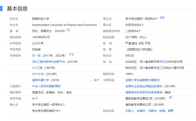 西南财经大学是教育部直属的国家“211工程”和“985工程”优势学科创新平台建设的全国重点大学,也是国家首批“双一流”建设高校。学校坐落于中国历史文化名城——“天府之国”成都,有光华、柳林两校区,辖地2300余亩。校园湖光柳影,芳草绿树,翩翩学者,蔚为大观,是著名的“园林式院校”,实乃读书治学的理想园地。 学校始于1925年在上海创建的光华大学。1938年,因抗战内迁建立光华大学成都分部。1952-1953年,先后汇聚西南地区17所院校的财经系科组建成四川财经学院,是建国之初全国高等院校分区布局的四所财经高校之一。1960年后历经分设、合并、更名等,于1978年恢复为四川财经学院。1979年由四川省人民政府划归中国人民银行主管,逐渐形成了独特的金融行业背景和出色的金融学科优势。1985年更名为西南财经大学,1997年成为国家“211工程”重点建设高校,2000年以独立建制划转教育部管理,2010年成为国家教育体制改革试点高校,2011年成为国家“985工程”优势学科创新平台建设高校,2017年成为国家首批“双一流”建设高校。 黄浦浣花风雨长,光华柳林谱华章。历经江流潮涌的时代变迁,西南财经大学始终与国家民族共命运,始终与时代发展同进步,栉风沐雨、奋进超越,培育了“经世济民、孜孜以求”的大学精神,奠定了“开放包容、求是创新”的学术底蕴,培养了“治国兴邦、奉献社会”的栋梁之才,铸就了“兴学报国、民族担当”的历史丰碑。 学校致力于培养德智体美劳全面发展,具有社会责任感、创新精神、国际视野的财经领域的卓越人才。设有28个学院(中心)等教学单位,41个本科专业;现有全日制在校学生24600余人,其中普通全日制本科生15800余人,硕士研究生7900余人,博士研究生820余人。建校以来,学校为国家经济建设和社会发展输送了一大批优秀人才,已成为国家金融、经济、管理等部门高水平人才培养的重要基地。本科生就业率达95.92%,国内外深造率40%,18万余名校友中涌现出一大批金融行业领军人物,被誉为“中国金融人才库”。 学校拥有国家经济学基础人才培养基地、全国大学生文化素质教育基地、基础学科拔尖学生培养计划2.0基地、国家级法学教育实践基地、“国际组织人才培养创新实践项目”基地等一批师资力量雄厚的教学与科研机构;拥有1个国家级教师教学发展示范中心、3个国家级实验教学示范中心、1个国家专业综合改革试点项目。学校主办的《经济学家》《财经科学》分别被评为全国高校社科名刊和精品期刊;创办英文学术期刊《Financial Innovation》成为近十年来国内第一本被SSCI收录的金融领域学术期刊;拥有馆藏丰富的现代化数字图书馆,也是目前西南地区最大的财经文献中心;设有西南地区高校唯一的货币类博物馆:货币金融博物馆。 学校不断强化学科发展战略引领,着力构建特色鲜明、优势突出、结构合理、充满活力的学科生态体系。现有理论经济学、应用经济学、工商管理、管理科学与工程、统计学、社会学、法学7个博士学位授权一级学科,6个硕士学位授权一级学科,19个专业学位授权点;拥有金融学、政治经济学、会计学和统计学4个国家重点学科,5个省级重点一级学科;有理论经济学、应用经济学、工商管理、管理科学与工程和统计学5个博士后流动站。应用经济学进入世界一流学科建设行列,“经济学与商学”“社会科学总论”“工程学”3个学科进入ESI全球前1%学科;工商管理通过EQUIS和中国高质量MBA双认证;中国大陆首家通过AACSB商科和会计双认证。2021泰晤士世界大学排名位居501—600,居国内同类院校首位。 学校深入实施创新驱动战略,坚持服务国家重大需求和学科前沿相结合,以重大现实问题为主攻方向,加强应用研究,产出一大批高水平的研究成果。获批中宣部首批“全国中国特色社会主义政治经济学研究中心”,拥有教育部人文社会科学重点研究基地“中国金融研究中心”“金融安全与发展学科创新引智基地” “金融安全协同创新中心”“中国家庭金融调查与研究中心”“西财智库”等一批新型高端智库。加强对国家、行业、区域经济社会发展重大理论和实践问题的研究,着力打造国家“金融智库”和“西部财经智库”。发挥学科专业和人才优势,主动响应国家精准扶贫战略,积极开展对口帮扶工作,勇担大学社会责任。 学校大力实施人才强校战略,在波澜壮阔的办学历程中,人文荟萃,名师云集。胡适、钱钟书、徐志摩、叶圣陶等大师在此传道讲学;谢霖、陈豹隐、汤象龙、许廷星、刘诗白等著名经济学家于此授业解惑。现有教职工2000余人,专任教师1300余人,其中,教授336余人、副教授567余人,博士生导师320余人,全职海归博士300余人,国家级人才113人,形成了海内外人才的“群聚效应”。 学校深入实施深度开放战略,高层次、宽领域、多渠道加强国际交流与合作。已与世界40余个国家和地区的两百余所知名大学、科研机构及知名企业建立了广泛的合作关系。获批3个中外合作办学项目、1个中外合作办学机构,开设全英文专业,培养设立学生出国(境)奖学金和“一带一路”国际学生奖学金。与加州大学伯克利分校、斯坦福大学、美国道富银行共创共建国际风险数据分析联盟、金融风险研究中心、金融科技国际联合实验室。建有北马其顿圣基里尔·麦托迪大学孔子学院及四川首家“汉语国际