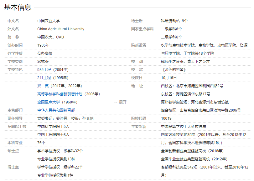 中国农业大学作为教育部直属高校,是我国现代农业高等教育的起源地,其历史起自于1905年成立的京师大学堂农科大学。1949年9月,由北京大学农学院、清华大学农学院和华北大学农学院合并为北京农业大学。1952年10月,北京农业大学农业机械系与中央农业部机耕化农业专科学校、华北农业机械专科学校、平原省农学院合并成立北京农业机械化学院,1985年10月更名为北京农业工程大学。1995年9月,北京农业大学与北京农业工程大学合并成立中国农业大学,江泽民同志亲自题写校名。现任党委书记姜沛民,校长孙其信。 长期以来,学校的建设与发展得到了国家的高度重视。北京农业大学于1954年被国务院列为全国6所重点院校之一,于1984年被列为全国重点建设的10所高等院校之一。北京农业机械化学院于1960年被列为全国重点大学之一。学校于1995年进入首批“211工程”建设行列,于2004年被确定为“985工程”重点建设的高水平研究型大学,2017年入选一流大学建设高校(A类),2022年学校及生物学、农业工程、食品科学与工程、作物学、农业资源与环境、植物保护、畜牧学、兽医学、草学等九个学科入选第二轮“双一流”建设高校及建设学科。2003年5月4日,国务院总理温家宝视察中国农业大学,发表了重要讲话。2005年10月13日,全国人大常委会吴邦国委员长视察中国农业大学,祝贺农大建校百年,鼓励学校再创辉煌。2009年5月2日,中共中央总书记、国家主席胡锦涛视察中国农业大学,与师生代表亲切座谈,对青年学生提出了殷切期望,对学校提出了“加快建设世界一流农业大学步伐”的要求。2010年5月2日,胡锦涛总书记给中国农业大学师生回信,鼓励全校师生为发展现代农业作出更大贡献。2012年9月15日,习近平同志来校参加全国科普日北京主场活动,在视察学校时要求学校教书育人和党的建设“两手抓两促进两不耽误”,“真正建成有中国特色的、具有农业特色的一流大学”,为学校发展进一步指明了方向,极大激发了全校师生的责任感和使命感。 历经百年的世纪风雨,中国农业大学已经发展成为一所以农学、生命科学、农业工程和食品科学为特色和优势的研究型大学,形成了特色鲜明、优势互补的农业与生命科学、资源与环境科学、信息与计算机科学、农业工程与自动化科学、经济管理与社会科学等学科群。学校是全国首批20个学位授权自主审核单位之一,通过自主审核增设了“营养与健康”“土地科学与技术”交叉学科博士学位授权点、农林高校首个“马克思主义理论”一级博士学位授权点。学校共设有18个学院、1个实体教学单位和1个直属系,涉及农学、工学、理学、经济学、管理学、法学、文学等7大学科门类;设有本科生院、研究生院、继续教育学院和体育教学部。在第四轮一级学科水平评估中,6个一级学科获评A+,获评A+的学科数量在全国高校中排名第六位;学校现有11个国家级科研平台,包括3个国家重点实验室,1个国家工程实验室,2个国家工程技术研究中心,1个国家级研发中心,1个国家级国际联合研究中心,3个国家野外科学观测研究站;108个省部级科研平台,包括3个示范型国际科技合作基地,1个省部级国际科技合作基地,95个省部级重点实验室/研究中心/基地,9个部级野外科学观测实验站。 中国农业大学拥有一支实力雄厚、结构合理的师资队伍。现有专任教师2007人,其中教授(含研究员)731人、副教授(含副研究员)988人。专任研究生导师1582人,其中博士生导师1020人、硕士生导师562人。聘期内兼职研究生第一导师205人,其中博士生导师74人、硕士生导师131人。中国农业大学具备培养学士、硕士、博士的完整教育体系。学校拥有19个博士后流动站,23个博士、33个硕士学位授权一级学科,1个专业博士、15个专业硕士学位类别,76个本科专业,8个第二学士学位专业。全日制本科生13483名,第二学士学位学生511名;全日制研究生12134名,其中全日制硕士研究生7026名,全日制博士研究生4279名;非全日制在籍研究生829名;在站博士后研究人员341名。 中国农业大学坚持“德才兼备、全面发展、通专平衡、追求卓越”的人才培养理念,培养德智体美劳全面发展,具有宽厚的人文与自然科学基础、扎实的专业知识与实践技能、富有创新精神与能力、厚植“三农”情怀的拔尖创新人才和行业领军人才。在教育部、中国高等教育学会的支持下,学校牵头成立全国新农科建设中心、高等教育学会高等农林教育分会,引领推动高等农林教育改革与创新。学校大力推进专业认证工作,牵头制定普通高等学校农林类专业认证标准,成为农科专业认证标准的制定者。农学专业率先通过国家农科专业(第三级)认证;植物保护、园艺两个专业率先通过中俄联合认证;农业水利工程、水利水电工程、车辆工程、电气工程及其自动化、计算机科学与工程、食品科学与工程六个专业通过工程教育专业认证。学校拥有3名国家高层次人才特殊支持计划(“高层次人才支持计划”)教学名师、2名国家级教学名师和46名北京市教学名师,5个国家级优秀教学团队、1个全国高校黄大年式教师团队、10个北京市优秀教学团队和3个北京高校优秀本科育人团队。积极推进一流本科专业建设,23个专业入选国家一流本科专业建设点,11个专业入选省级一流本科专业建设点,2个专业入选北京市重点建设一流专业。此外,拥有14个教育