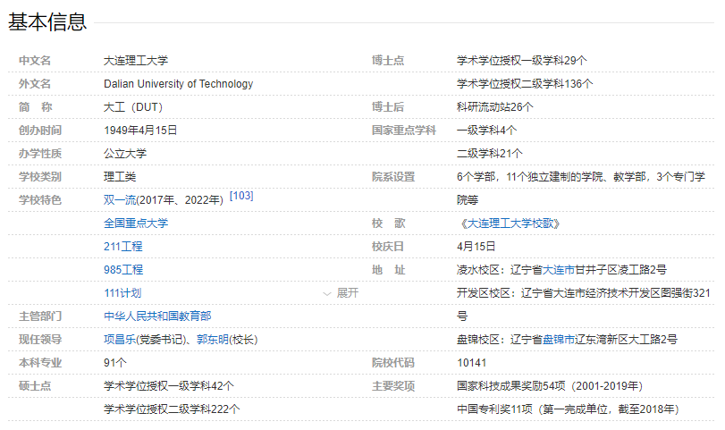 大连理工大学是中国共产党在新中国成立前夕,面向新中国工业体系建设亲手创办的第一所新型正规大学。 大连理工大学是教育部直属全国重点大学,是国家“211工程”和“985工程”重点建设高校,也是世界一流大学A类建设高校。学校以培养精英人才、促进科技进步、传承优秀文化、引领社会风尚为宗旨,秉承“海纳百川、自强不息、厚德笃学、知行合一”为基本特质的大工精神,致力于创造、发现、传授、保存和应用知识,勇于担当社会责任,服务国家,造福人类。 大连理工大学1949年4月建校,时为大连大学工学院;1950年7月大连大学建制撤销,大连大学工学院独立为大连工学院;1960年10月被确定为教育部直属全国重点大学;1986年4月设立研究生院;1988年3月更名为大连理工大学;1996年启动实施“211工程”建设,教育部、辽宁省、大连市共建大连理工大学;2001年启动实施“985工程”建设,教育部、辽宁省、大连市重点共建大连理工大学;2003年被中央确定为中管干部学校。2012年12月教育部正式批准大连理工大学依照“统筹规划、错位发展、坚持标准、创新模式”的指导思想建设盘锦校区,与主校区同标准、同档次、同水平办学。2017年9月,经国务院批准,入选世界一流大学A类建设高校名单;2022年2月,入选国家第二轮“双一流”建设高校名单。 学校现有教职工4473人,其中专任教师2945人。学校有中国科学院和中国工程院院士15人、中国科学院外籍院士1人、瑞典皇家工程院院士1人,兼职教师中的两院院士34人,专任教师中正高级职称1004人,副高级职称1225人。国务院学位委员会学科评议组成员10人,国家杰出青年基金获得者48人,“973计划”项目首席科学家10人,“973计划”青年科学家专题项目首席科学家2人,百千万人才工程国家级人选22人,科技部创新人才推进计划中青年科技创新领军人才入选者18人,教育部跨世纪优秀人才基金获得者17人,“国家级教学名师奖”获得者4人,辽宁省普通高等学校本科教学名师76人,“兴辽英才计划”教学名师3人。博士生导师1084人,硕士生导师2439人。 学校现有学生总数46450人,其中本科生总人数25603人(普通本科生25444人,第二学士学位159人)。研究生总人数20847,其中博士研究生4841人(全日制学术学位博士生4421人、全日制专业学位博士生312人、非全日制专业学位博士生108人),硕士研究生16006人(全日制学术学位硕士生7112人、全日制专业学位硕士生6533人,非全日制专业学位硕士生2361人)。 学校坚持以立德树人为根本,本科生教育与研究生教育并重,已形成以理工为主,理、工、经、管、文、法、哲、艺术等协调发展的多学科育人体系。学校设有研究生院,主校区设有20个独立建制的学部学院,开发区校区设有3个独立建制的学院,盘锦校区设有3个独立建制的学院,另有3个专门学院(创新、国际、远程)和1所独立学院(城市学院)。有29个一级学科博士点,138个二级学科博士点,42个一级学科硕士点,235个二级学科硕士点,26个博士后科研流动站,还有工商管理、公共管理等20个专业学位类别,电子信息、机械、材料与化工、土木水利等4个博士专业学位类别以及高校教师在职攻读硕士学位授予权。学校设有93个本科专业,82个本科专业进行招生,其中国家级特色专业23个,“双万计划”国家级一流本科专业建设点40个,省级一流本科专业建设点26个,通过全国工程教育认证(评估)专业26个,4个专业入选教育部“强基计划”。有4个国家级教育、教学基地(国家工科化学教学基地、国家大学生文化素质教育基地、国家集成电路人才培养基地、国家理科基础科学研究和教学人才培养基地),8个国家级实验教学示范中心(基础化学实验教学中心、工程训练中心、电工电子实验教学中心、基础物理实验教学中心、土木水利实验教学中心、文科综合实验教学中心、化工综合实验教学中心、机械工程实验教学中心),3个国家级虚拟仿真实验教学中心(化学虚拟仿真实验教学中心、电工电子虚拟仿真实验教学中心、车辆工程虚拟仿真实验教学中心),7个国家级教学团队,5个国家基础学科拔尖学生培养计划2.0基地(华罗庚数学拔尖学生培养基地、张大煜化学拔尖学生培养基地、王大珩物理学拔尖学生培养基地、钱令希力学拔尖学生培养基地、计算机科学拔尖学生培养基地),是教育部“三全育人”综合改革首批十所试点高校之一,国家实施工程教育改革十所试点学校之一,国家首批大学生创新性实验计划试点学校之一,首批全国高校实践育人创新创业基地,首批全国高校创新创业典型经验高校,首批全国深化创新创业教育改革示范高校,教育部首批“卓越工程师教育培养计划”的试点高校之一,教育部首批公共外语教学改革试点高校之一,获批教育部首批课程思政教学研究示范中心。 学校的力学、机械工程、化学工程与技术入选国家第二轮“双一流”建设学科名单,有20个一级学科入选辽宁省一流学科建设项目,优势学科资源丰富、研究实力雄厚。在世界一流大学建设中,学校重点建设化学化工、装备制造、运载、建设工程、信息科学,以及管理、数理、马克思主义理论等“7+1”学科集群。有一级学科国家重点学科4个,二级学科国家重点学科6个。在全国第四轮学科评估结果中,7个学科进入A类,19个学科进入B类;在首次全国专业学位水平评估中,工商管理和公共管理分获A和A-。上海软科最好