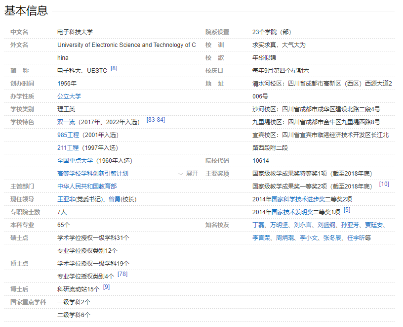电子科技大学坐落于四川省成都市,原名成都电讯工程学院,是1956年在周恩来总理的亲自部署下,由交通大学(现上海交通大学、西安交通大学)、南京工学院(现东南大学)、华南工学院(现华南理工大学)的电讯工程有关专业合并创建而成。 学校1960年被中共中央列为全国重点高等学校,1961年被中共中央确定为七所国防工业院校之一,1988年更名为电子科技大学,1997年被确定为国家首批“211工程”建设的重点大学,2000年由原信息产业部主管划转为教育部主管,2001年进入国家“985工程”重点建设大学行列,2017年进入国家建设“世界一流大学”A类高校行列。2019年教育部和四川省签约共同推进我校世界一流大学建设。2022年入选国家第二轮“双一流”建设高校名单。经过60余年的建设,学校形成了从本科到硕士研究生、博士研究生等多层次、多类型的人才培养格局,成为一所完整覆盖整个电子信息类学科,以电子信息科学技术为核心,以工为主,理工渗透,理、工、管、文、医协调发展的多科性研究型大学,成长为国内电子信息领域高新技术的源头,创新人才的基地。 学校设有清水河、沙河、九里堤、永宁四个校区,校舍总建筑面积139万余平方米,拥有馆藏丰富的现代化数字图书馆和一批设施齐备的现代化体育场馆。校园四季树木葱茏、湖水碧波荡漾、建筑典雅厚重,是陶冶情操、读书治学的佳境。 学校坚持学生为中心、通专结合,以“价值塑造、启迪思想、唤起好奇、激发潜能、探究知识、个性发展”六位一体为培养理念,致力于培养具有家国情怀、全球素养、扎实基础、知识综合与集成创新能力,未来能引领学术前沿、科技与社会经济发展,堪当民族复兴大任的创新引领性人才。学校设有23个学院(部),65个本科专业,其中13个为国家级特色专业,24个专业入选国家级一流本科专业建设点,现有在读本、硕、博学生40000余人。本科生国内外深造率超过2/3,其中出国(境)深造率超过1/5。学生就业率一直保持在95%以上,超过半数的研究生赴国家重点单位就业。研究生在国际顶级学术期刊发表论文的数量显著增加,获得省部级及以上科技成果奖的人数不断增加。成电学子遍布海内外,以素质全面、专业知识扎实、能力强、后劲足等鲜明特点受到了社会各界和用人单位的普遍赞誉。 学校高度重视学生创新实践能力培养,支持和鼓励学生积极参与科技创新、文化艺术和社会实践活动。学生活跃在中国国际“互联网+”大学生创新创业大赛、“挑战杯”全国大学生课外学术科技作品竞赛、“挑战杯”全国大学生创业计划大赛、“创青春”全国大学生创业大赛、中国研究生创新实践系列大赛、全国大学生电子设计竞赛、全国大学生集成电路创新创业大赛、全国大学生数学建模竞赛、IEEEXtreme极限编程大赛、ACM-ICPC国际大学生程序设计竞赛、全国大学生机器人竞赛、全球大学生基因工程大赛、国际大专辩论赛、全国大学生艺术比赛等高水平赛场上,争金夺银,成绩斐然,在“中国高校创新人才培养暨学科竞赛评估”中名列前茅。 学校已建成国家精品在线开放课程等一批国家精品课程、精品教材,拥有国家大学生文化素质教育基地,以及国家级实验教学示范中心、虚拟仿真实验教学示范中心、工程实践教育中心、全国工程专业学位研究生联合培养示范基地等20余个国家级教育教学实践基地和示范中心,获得一批国家级教学成果奖。 学校大力实施学科提升战略,扎实推进理工深度融合,学科影响力持续提升。学校现有2个国家一级重点学科(所包括的6个二级学科均为国家重点学科)、2个国家重点(培育)学科。一级学科博士学位授权点19个,一级学科硕士学位授权点31个,博士专业学位授权点4个、硕士专业学位授权点12个。设有博士后流动站15个。在第四轮全国一级学科评估中,学校4个学科获评A类,其中电子科学与技术、信息与通信工程两个学科为A+,A+学科数并列西部高校第一。 学校大力实施服务国家重大需求战略,以“顶天、立地、树人”为科研工作定位,坚持“开放、聚焦、融合、奋斗”的发展理念,面向世界科技前沿、面向经济主战场、面向国家重大需求、面向人民生命健康,努力推进基础研究与应用研究并重的科技创新格局,不断提升集成攻关和原始创新能力。学校拥有国家级重点实验室4个,国家工程技术研究中心1个,国家地方联合工程实验室(研究中心)2个,共建国家工程实验室2个、国家级工业创新中心1个,首批国家专业化众创空间1个,省部级科研机构59个,国家自然科学基金委创新群体6个、教育部创新团队6个和国防科技创新团队3个。获批建设国家集成电路产教融合创新平台。“十一五”以来,学校科技成果获国家级奖励35项、部省级奖励365项。学校充分发挥学科、人才和科研优势,积极投身“一带一路”建设及粤港澳大湾区、长江经济带建设,在珠三角、长三角、成渝地区双城经济圈等设立研究机构,积极服务四川省产业转型升级,助力四川构建现代化产业体系。与成都市共同实施“一校一带”行动计划,建设高校成果转化产业带,携手打造中国“西部硅谷”。 学校大力实施人才优先发展战略,现有教职工3800余人,其中教师2500余人,教授660余人。截至目前,我校现有中国科学院院士、中国工程院院士等高层次人才300余人。 学校大力实施国际化发展战略,已与世界70多个国家