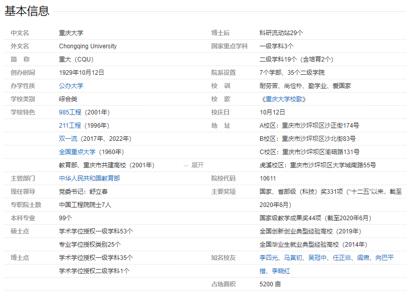 重庆大学是中央直管、教育部直属的全国重点大学,国家“211 工程”和“985 工程”重点建设的高水平研究型综合性大学,国家“世界一流大学建设高校(A类)”。 学校创办于1929年,在20世纪40年代就发展为拥有文、理、工、商、法、医6个学院的国立综合性大学。经过1952年全国院系调整,成为国家高教部(高教部1958年并入教育部)直属的、以工科为主的多科性大学。1960年被确定为全国重点大学。改革开放以来,学校大力发展人文社科类学科专业,促进了多学科协调发展,逐步发展为综合性研究型大学。1998年,学校成为国家“211 工程”重点建设高校。2000年5月,原重庆大学、重庆建筑大学、重庆建筑高等专科学校三校合并组建成新的重庆大学。2001年,学校成为“985工程”重点建设高校。2004年,学校被确定为中管高校。2017年9月,学校入选国家“世界一流大学建设高校(A 类)”。 学校学科门类齐全,涵盖理、工、经、管、法、文、史、哲、医、教育、艺术11个学科门类。设7个学部35个学院,以及附属肿瘤医院、附属三峡医院、附属涪陵医院、附属中心医院。教职工5300余人,在校学生49000余人,其中研究生22000余人,本科生26000余人,来华留学生1700余人。校园占地面积5300余亩,有A校区、B校区、C校区和虎溪校区。 学校坚持以习近平新时代中国特色社会主义思想为指导,深入贯彻习近平总书记关于教育的重要论述,全面贯彻党的教育方针,不忘立德树人初心,牢记为党育人、为国育才使命,持续深化综合改革,推动内涵发展、特色发展、高质量发展,各项事业保持快速向上向好发展势头,综合办学实力、学术声誉和影响力显著提升。 人才培养以造就“行业精英、国家栋梁”为己任,为国家和地方经济社会发展培养输送了40余万名高素质人才,培养了一大批杰出的科学家、教育家、企业家和工程技术人员,40余人当选为两院院士。近年来,认真落实全国高校思想政治工作会议、全国教育大会精神,构建十大育人体系,建设六大育人阵地,入选全国首批10所“三全育人”综合改革试点高校、20所“高校思想政治工作创新发展中心”承建高校。大力实施“本科教育2029行动计划”,打造一流本科教育。成立本科生院,全面实施大类招生、大类培养,加强通识教育。43个专业入选国家级一流本科专业,30门课程入选首批国家级一流本科课程;数学、物理专业进入“强基计划”。持续深化培养体制机制改革,打造卓越研究生教育。获批学位授权自主审核高校,有一级学科博士学位授权点35个,一级学科硕士学位授权点53个,专业学位授权点25个;全面推行博士生“申请—考核”制招生,博士生招生规模增至1000余人。深化“产教融合、跨界培养”,积极推进创新创业教育,五年来在全国各类大学生竞赛中获奖4400余项,其中获全国特等奖和一等奖260余项。 学科建设坚持以学科内涵发展为核心,按照“强化工科、夯实理科、振兴文科、繁荣社科、拓展医科、提升信科”的思路,建立健全适应科技高速变革的学科优化布局机制以及适宜产生未来引领学科的体制机制,着力构建一流学科生态。持续加大“先进制造”“智慧能源”“新型城镇化”三大学科群建设,按照新一轮“双一流”建设规划,推动机械、电气、土木等特色优势学科率先达到世界一流。先后成立医学院、医学部,高起点推进医学学科加快发展。启动实施《基础文科振兴行动计划》《基础理科卓越行动计划》,加快提升基础学科整体发展水平。工程学、材料科学先后进入 ESI 世界前 1‰学科,12个学科进入ESI世界前1%;冶金、仪器、矿业、机械、土木、交通运输等6个学科进入“软科”世界一流学科排名前 50名。 人才队伍大力实施人才强校战略,系统构建起“3+7”人事人才制度体系和四层次七类别人才引育“金字塔”,积极营造“近者悦、远者来”的人才发展氛围,以先进体制机制激发高层次人才持续汇聚的内生动力。现有专任教师3100余人,其中院士等国家级人才200余人,博士生导师1000余人,副高级以上专业技术人员2000余人。 科学研究深化科研管理服务改革,构建起“1+5”新型科研创新体系,以新的体制机制促进高质量成果产出。加强创新体系内涵建设,全面实施基础研究珠峰计划、重大项目成果人才培育计划、重点研究基地构筑计划、军民融合发展行动计划。加强科研前瞻布局,全面融入西部(重庆)科学城建设,推动建设重庆大学科学中心,培育建设“超瞬态实验”大科学装置,推动成立人工智能研究院、智慧城市研究院等跨学科交叉研究平台,谋划建设合成生物学、未来芯片、量子物质科学等高水平原始创新平台。“十三五”以来,新增国家和省部级科研平台23个,获批国家级科研项目 2400 余项(其中牵头千万元级以上重大项目40余项),荣获国家奖和省部级科技奖励一等奖60余项,国家科技进步一等奖、大科学装置建设、国家自然科学基金重大项目、《Nature》《Science》正刊论文等均取得历史性突破,科研总经费屡创新高(2020年达到22.85亿元),发表高水平论文数量和获权发明专利数量显著增长。实施人文社科繁荣计划,获得国家重点研发计划项目,荣获鲁迅文学奖,持续推进“中国工程科技发展战略重庆研究院”“地方政府治理协同创新中心”“城市化与区域创新极发展研究中心”“重庆人才发展研究院”等新型高端智库平台建设,服务科学决策
