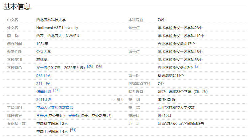 西北农林科技大学地处中华农耕文明发祥地、国家级农业高新技术产业示范区——陕西杨凌,是教育部直属、国家原“985工程”和“211工程”重点建设高校,首批入选国家“世界一流大学和一流学科”建设高校。现任党委书记李兴旺、校长吴普特。 学校前身是创建于1934年的国立西北农林专科学校,为西北地区最早的高等农林教育学府。学校自诞生之日起,就与国家和民族的命运休戚相关、荣辱与共,肩负着建设西北、兴学兴农、培育英才的历史重任。1999年9月,党中央、国务院为实施西部大开发战略和推进科教体制统筹改革,将同处杨凌的原西北农业大学、西北林学院、中国科学院水利部水土保持研究所、水利部西北水利科学研究所、陕西省农业科学院、陕西省林业科学院、陕西省中国科学院西北植物研究所等7所科教单位合并组建成立西北农林科技大学,实行部省院共建机制,赋予学校支撑和引领干旱半干旱地区现代农业发展的重要使命。2019年,教育部等七部省院局联合出台意见继续深化共建西北农林科技大学,协力支持学校加快建设世界一流农业大学,为学校发展带来了新机遇。 建校80余年来,一代代西农人秉承“经国本、解民生、尚科学”的办学理念,恪守“诚朴勇毅”的校训,承远古农神后稷之志,行当代“教民稼穑”之为,形成了“扎根杨凌、胸怀社稷,脚踏黄土、情系三农,甘于吃苦、追求卓越”的西农精神和“团结、求真、坚韧、自信”的西农科学文化,走出了一条产学研紧密结合的特色办学之路,为推动我国农业现代化建设和农业科教事业发展作出了重要贡献。 学校设有研究生院和28个学院(部、所),共有14个博士后流动站,16个博士学位授权一级学科,28个硕士学位授权一级学科,2个博士专业学位授权类别,17个硕士专业学位授权类别,74个本科专业。现有7个国家重点学科和2个国家重点(培育)学科;农业科学、植物学与动物学、工程学、环境科学与生态学、化学、生物学与生物化学、药理学与毒理学、分子生物学与遗传学、微生物学、地球科学等10个学科进入ESI全球学科排名前1%,农业科学、植物学与动物学2个学科进入ESI前1‰之列。目前,已发展为全国农林水学科最为齐备的高等农业院校。 早在1934年建校之初,学校即开始招收本科生,1941年开始招收研究生。长期以来,学校坚持“厚基础、宽口径、强实践、重创新、高素质、国际化”的总体思路,着力培养具有坚定理想信念、社会责任感和“三农”情怀,具有创新精神、实践能力和国际视野,服务现代农业发展的学术精英、创新创业技术领军人才和社会发展管理人才。学校高度重视一流本科教育,积极参与“新农科”建设,25个专业入选国家一流本科专业建设点,“生物科学拔尖学生培养基地”入选教育部基础学科拔尖学生培养计划2.0。拥有1个国家生命科学与技术人才培养基地、3个国家级人才培养模式创新实验区、12个国家级特色专业、8个“卓越农林人才教育培养计划”专业。农学专业通过农科专业(第三级)认证,水文与水资源工程、农业水利工程、水利水电工程、食品科学与工程专业通过工程教育专业认证。拥有“万人计划”教学名师2人,国家级教学名师2人,国家级教学团队5个,建成国家级精品课程12门、国家级精品资源共享课8门、国家级视频公开课4门、国家级一流本科课程20门,入选国家级“十一五” “十二五”规划教材52种,获国家优秀教材二等奖1种。学校坚持立德树人,促进学生全面发展,设有综合素质教育学院。重视大学生创新能力培养,鼓励和支撑学生参加各类高水平学科竞赛、创新创业项目训练与实践,多次获全国“互联网+”大赛、“挑战杯”学术课外竞赛等顶级赛事国家第一级别奖,位居全国农林高校前列。建校以来为社会累计培养输送各类人才20余万名,毕业生遍布海内外,有19位校友成为两院院士,为西北乃至全国农业现代化建设及农村经济社会发展作出了重要贡献。 学校坚持“顶天”“立地”相结合的科技工作方针,瞄准国际科技前沿,紧扣国家战略需求和区域发展需要,积极开展面向农业生产实际的应用基础研究和应用技术研究,在农作物遗传育种与病虫害防治、水土保持与生态修复、旱区农业高效用水、经济林果育种与栽培、畜禽良种繁育与健康养殖、农业生物技术、设施农业工程、葡萄与葡萄酒等研究领域形成鲜明特色和优势。建校以来,学校累计获得各类科技成果6000余项,获奖成果1800余项。培育出了世界累计推广面积最大的优良小麦品种“碧蚂1号”,长期主导我国小麦品种换代的远缘杂交小麦良种“小偃6号”,以及我国自主培育和推广面积最大的优良苹果品种“秦冠”等重要科技成果,推广转化直接经济效益累计超过3000亿元。合校以来,学校牢记服务旱区可持续发展的国家使命,始终站在助推西部大开发、国家“一带一路”建设、乡村振兴战略前沿,累计获得国家级科技奖励44项,主持完成省部级一等奖95项,获国家授权发明专利1812件。研究的黄土高原苹果优质高效绿色生产的系列关键技术,支撑引领黄土高原成为世界公认、全国最大的优质苹果生产基地。构建的土壤侵蚀调控技术体系,攻克了黄土高原生态环境建设这一世界难题,助推陕西绿色版图向北推移400公里,为国家实施退耕还林(草)工程发挥了重要作用。 学校在长期办学实践中积淀形成了