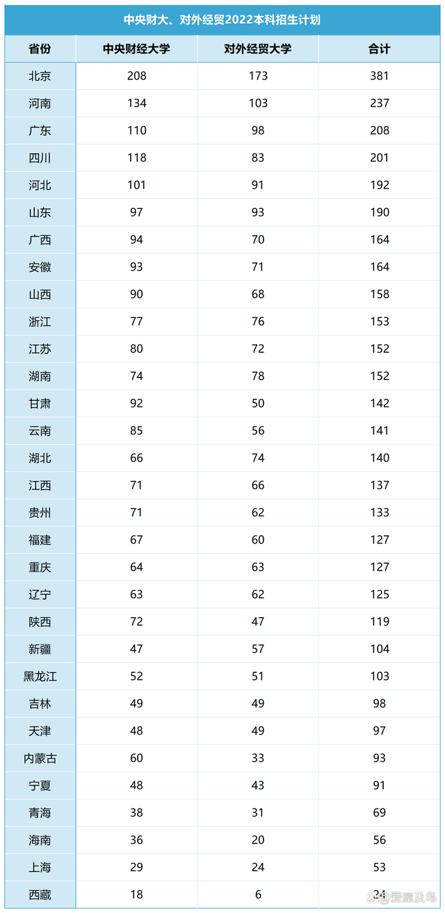 日前,北京的两所财经类双一流高校——中央财经大学、对外经济贸易大学公布了2022年本科招生计划,主要生源地都有哪些呢?下面就一起来了解一下吧。 中央财经大学和对外经贸大学的本科招生规模都很小,2022年本科招生计划都未超过3000人。虽然两校都属于教育部直属高校,但毕竟身处北京,因此投放在北京本地的招生名额是最多的,分别为208人、173人,不过本地生占比均为超过10%。和那些本地生超过20%甚至30%的双一流高校相比,中央财经大学和对外经贸大学本科生本地生比例应该是比较低的。 除了北京以外,中央财经大学本科招生计划超过100人的省份还有河南(134人)、四川(118人)、广东(110人)、河北(101人),对外经贸大学招收相对较多的省份还有河南(103人)、广东(98人)、山东(93人)、河北(91人)。 整体来看,中央财经大学、对外经贸大学在河南和广东两地投放的招生计划相对都比较多,其中河南是中部省份,高考报名人数超百万,连年高居全国第一,是很多双一流高校本科新生主要生源地。而广东的情况很多人就不理解了,为何北京这两所财经类双一流在广东的招生人数比河北、山东都要多呢?毕竟广东属于南方省份,和北京地理位置相距甚远,且广东本身就有很多双一流高校。 和广东的情况比较类似的还有四川,北京有不少双一流高校在四川招生人数也很多。个人认为主要原因和高考报名人数、生源质量等都有一定关系,全国高考报名人数最多的5个省份,广东和四川都上榜。除了河南以外,山东、广东、四川和河北4省的高考报名人数差距并不是很大,因此不同高校在这4省投放的招生名额相对都比较多,只不过每个省之间存在略微的差距。 另外还有一个区别就是中外合作办学专业,中外合作办学专业投放招生计划的省份主要是中东部省份,尤其是经济比较发达的地区。以中央财经大学为例,除了北京以外,在广东投放的中外合作办学专业招生名额是最多的,共计计划招生15人。目前中央财经大学只有国际经济与贸易一个中外合作办学专业,学费为每生每学年7万元,这样高昂的学费不是一般家庭能承受得起的。 |