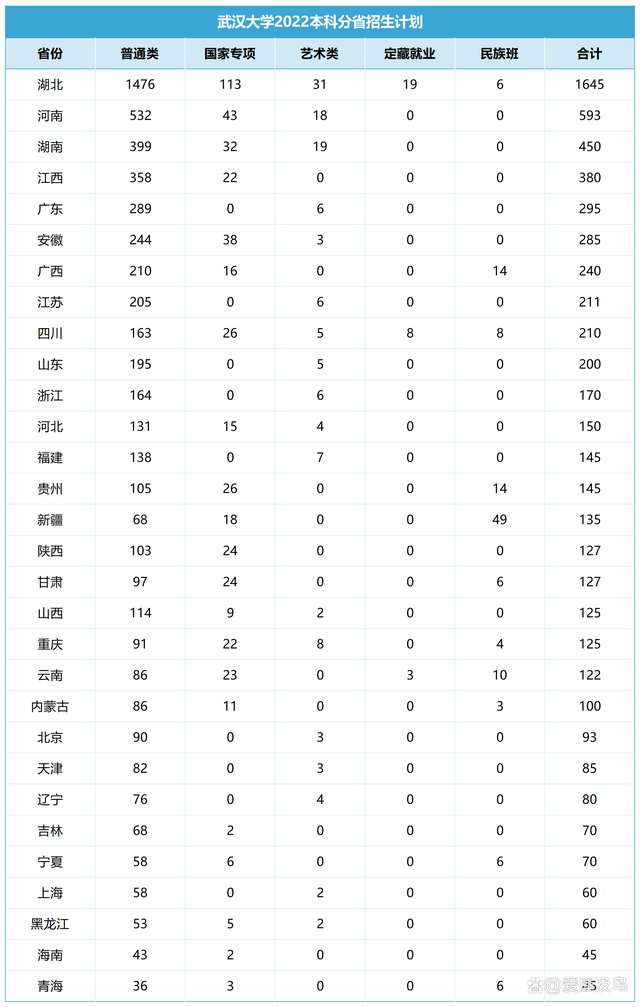 大学排行网 从 武汉大学 了解到,武汉大学2022高考本科分省招生计划已公布,包含普通类、国家专项计划、艺术类、定藏就业和民族预科班等类型,其中湖北本地投放名额仅 1645人,其中 物理类 招生 1088 人,历史类招生 388 人。约占总计划的 22.8% 左右。下面就来具体看看在湖北本地以及省外的招生情况吧。 在985高校中,武汉大学的本科招生规模绝对能排进前十位,2022年学校面向全国计划招收本科生6500余人,当然这个分省招生计划是不包含高校专项计划、强基计划等特殊类型的,武汉大学每年实际录取的本科生人数在7000人以上。 具体来看,武汉大学在湖北本地投放了1645个招生名额,其中普通类1476人、国家专项计划113人、艺术类31人、非西藏生源定藏就业16人、民族预科班6人,本地生占比在25%左右。也就是说在武汉大学的本科新生中,每十个人中就有2—3人是湖北考生。 武汉大学今年本科招生计划在100人及以上的省份共有 21个,除了湖北以外,招生最多的三个省份为河南、湖南和江西,在这三地分别投放了593个、450个、380个招生名额。河南、湖南和江西都属于中部地区,且都与湖北相邻,一直都是武汉大学本科招生的主要生源地。 值得注意的是,和往年相比,虽然武汉大学今年总的招生规模及在湖北本地的招生计划变化不大,但在某些招生类型及某些专业招生计划的分配上有一定的变动。像口腔医学、法学、经济学类、新闻传播学类等热门专业招生计划数较往年有一定增加。 还有非西藏生源定藏就业,武汉大学的这种招生类型目前只在湖北、四川和云南三地有招生计划。和去年相比,武汉大学今年取消了在重庆的非西藏生源定藏就业招生计划,去年在湖北的招生计划为8人,而今年增加至19人。武汉大学发布的招生政策显示,这种定向招生类型只招应届生不招往届生,只录取明确填报这类专业志愿的考生,在学校投档线上生源不足时,可降低40分择优录取,但考生的高考总分须不低于所在省份一本线。 在招生专业方面,今年武汉大学新增了大数据管理与应用,智能制造工程,储能科学与工程,智能建造,政治学、经济学与哲学(弘毅学堂PPE试验班)等6个专业。由于武汉大学实行的是大类招生,这6个专业又被划分到不同的招生大类。 在湖北投放的招生计划中,有3个普通类专业招生名额在百人以上,分别为工科试验班(B含卓越工程师教育培养计划)、电子信息类(含卓越工程师教育培养计划)、计算机类(计算机学院),仅这3个专业在湖北的招生计划,就比大多数省份总的招生计划都要多。 值得注意的是,武汉大学有两个计算机招生大类,一个隶属于计算机学院,含计算机科学与技术、人工智能、软件工程3个专业方向,武汉大学的计算机学院是全国首批设立、湖北省唯一的国家特色化示范性软件学院。另一个隶属于网络安全学院,包含信息安全、网络空间安全两个专业方向。